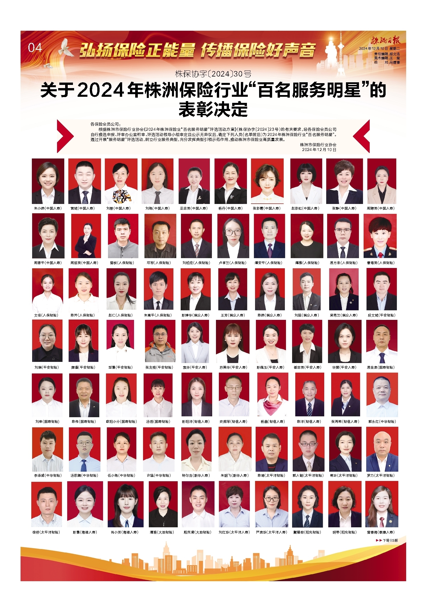关于2024年株洲保险行业“百名服务明星”的 表彰决定