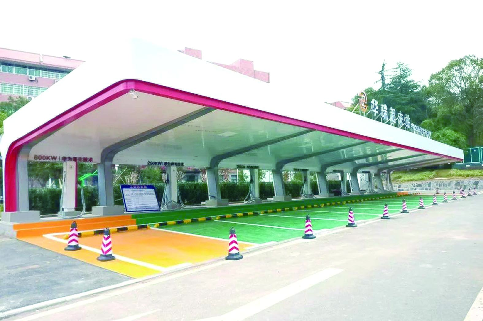 站场采用华为全液冷超充设备,配置有2台600KW超充充电桩和5台250KW双枪快充充电桩,设置了可供所有充电桩同时使用的12个停车位。600KW超充充电桩的充电速度可达“一秒一公里”。液冷散热技术使充电桩在高功率输出或高温环境下依然能够保持稳定的工作效率,为高速充电过程提供安全保障。