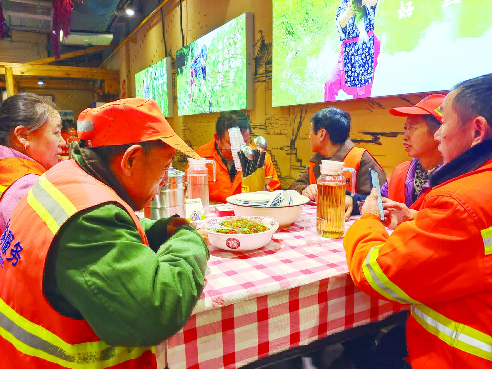 环卫工在享用“爱心营养餐”。 记者/何春林 摄