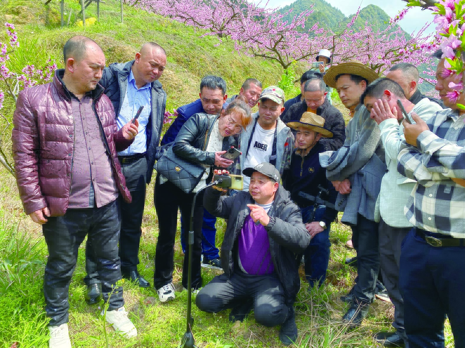 阿抖(中间下蹲者)带“粉丝”们在炎陵县乡村桃园拍摄视频素材(资料图)。受访者供图