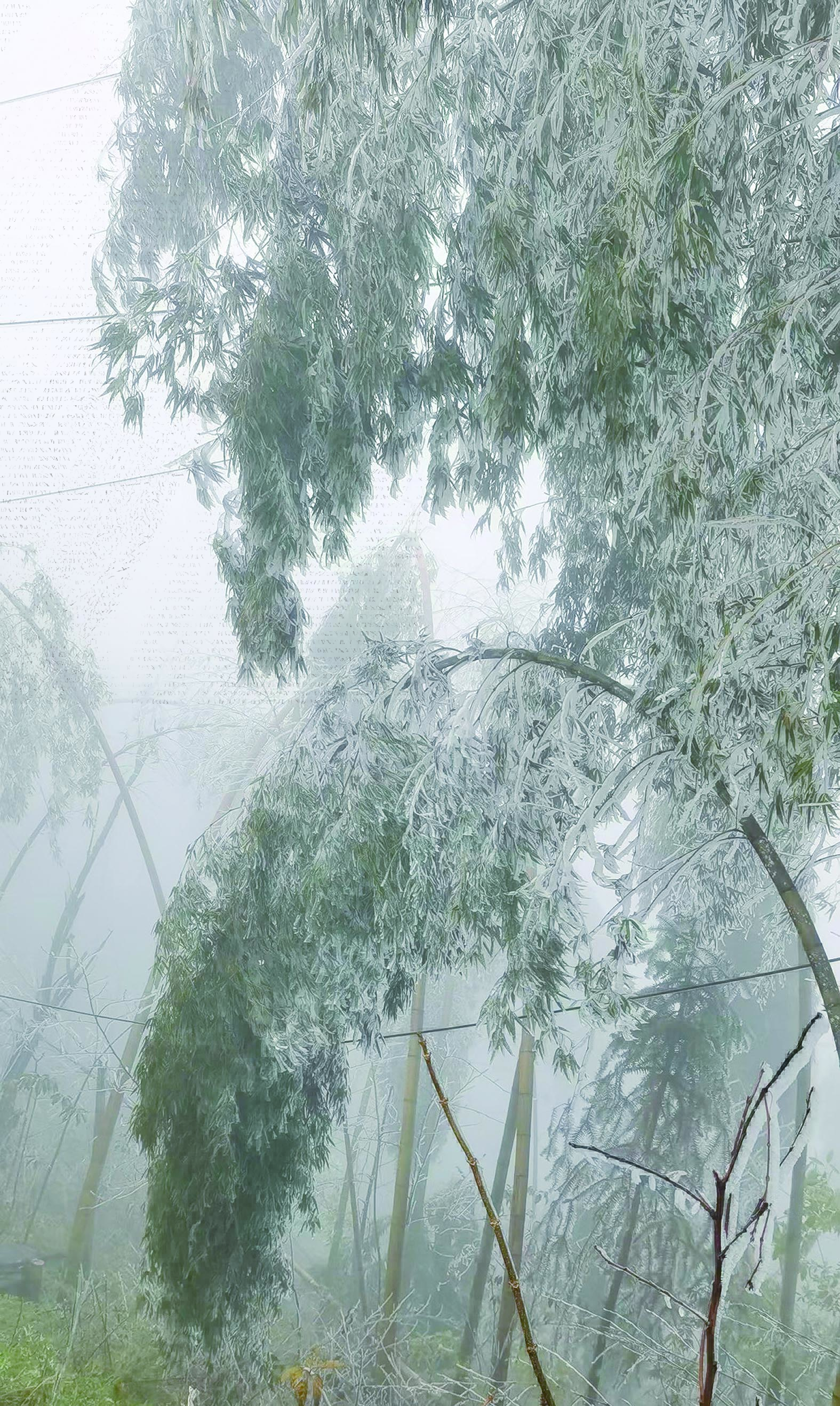 大院农场平均海拔1350米,年均气温12.6℃,比全县年均气温低3.4℃至5.4℃。在大院农场放眼望去,从山腰到山顶,披上了一层晶莹剔透的外衣,树木树枝被冰晶包裹,形成了形态各异的雾凇,朵朵凇花迎风绽放,玉树琼枝美轮美奂,构成了一个冰清玉洁的童话世界。