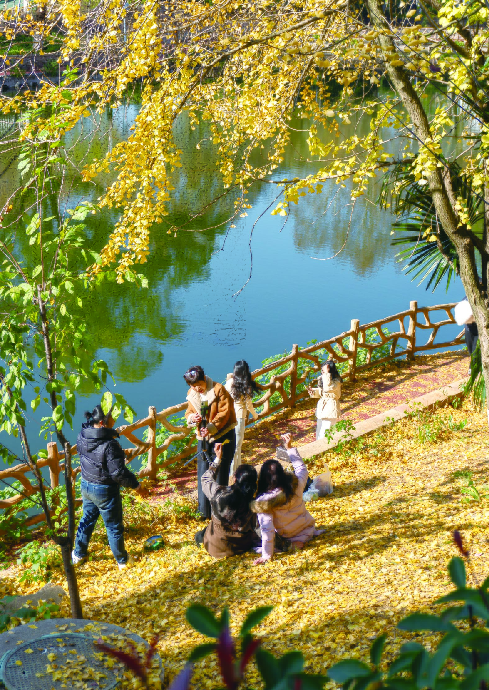 12月16日,神农公园,暖阳下的冬景五彩斑斓,吸引不少游人。图为游人在公园银杏树下打卡。株洲日报全媒体记者/刘震 摄