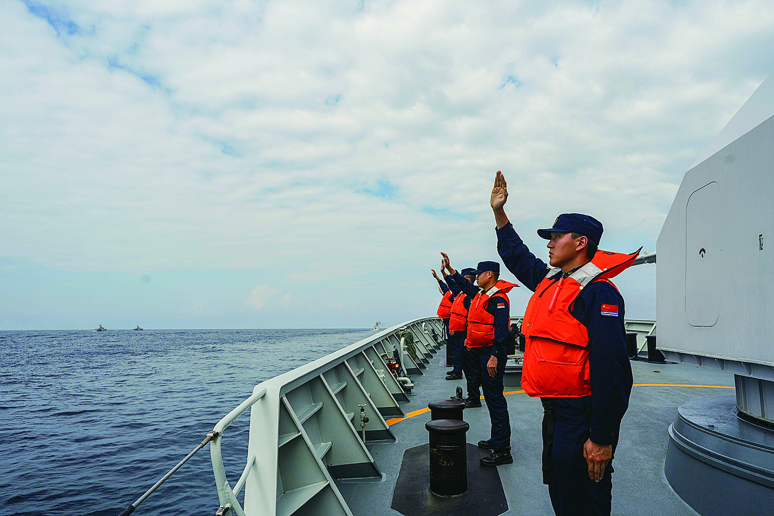 12月4日,在中越第37次北部湾联合巡逻中,中方联合巡逻官兵向越方挥手告别。新华社发