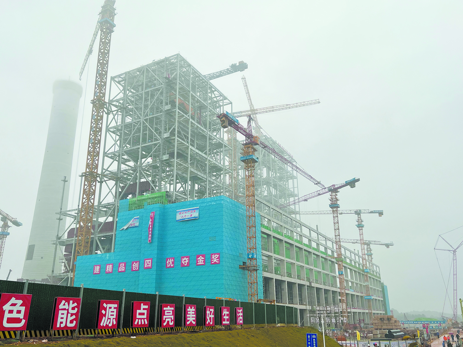 自去年12月开工以来,项目上陆陆续续“冒”出了煤棚、烟囱、锅炉房、汽机房等标志性建构筑物,一旁的冷却塔正以每周10米的速度升高……