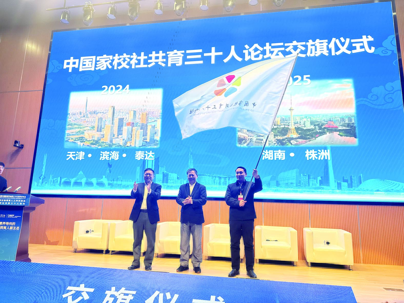 市教育局相关负责人从主办方手中接过会旗,我市将承办2025年中国家校社协同育人论坛。通讯员供图
