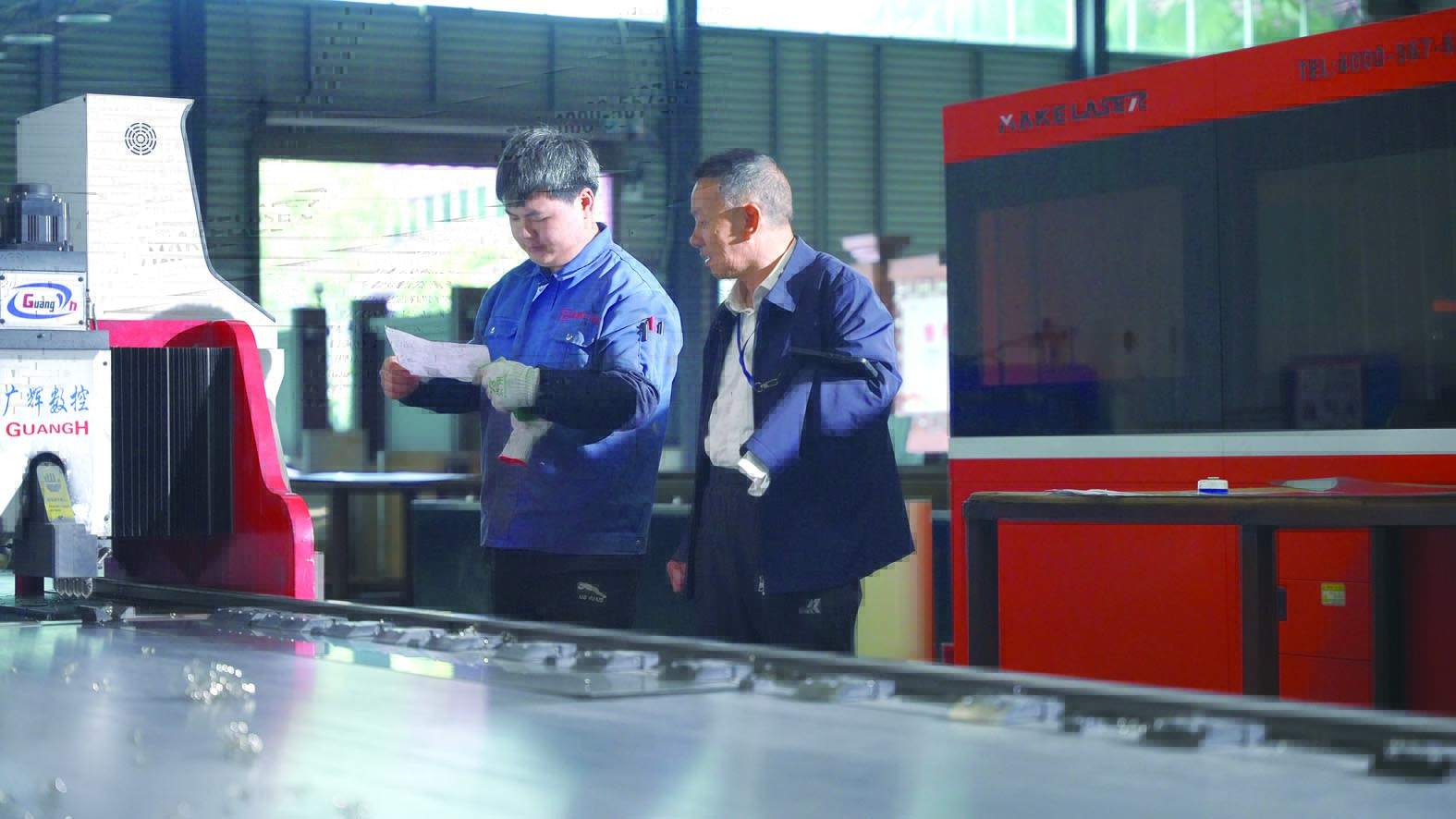 龙春成(右)在车间检查产品的质量。 记者/何春林 摄