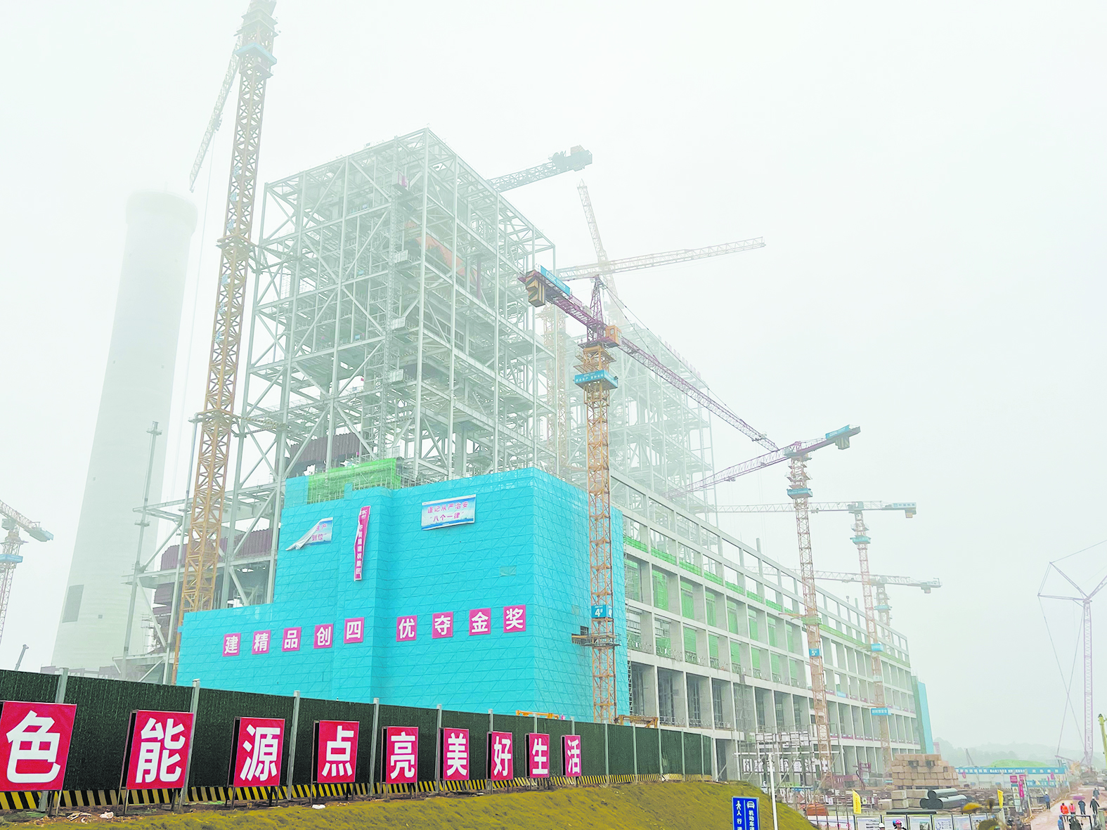 自去年12月开工以来,项目上陆陆续续“冒”出了煤棚、烟囱、锅炉房、汽机房等标志性建构筑物,一旁的冷却塔正以每周10米的速度升高……