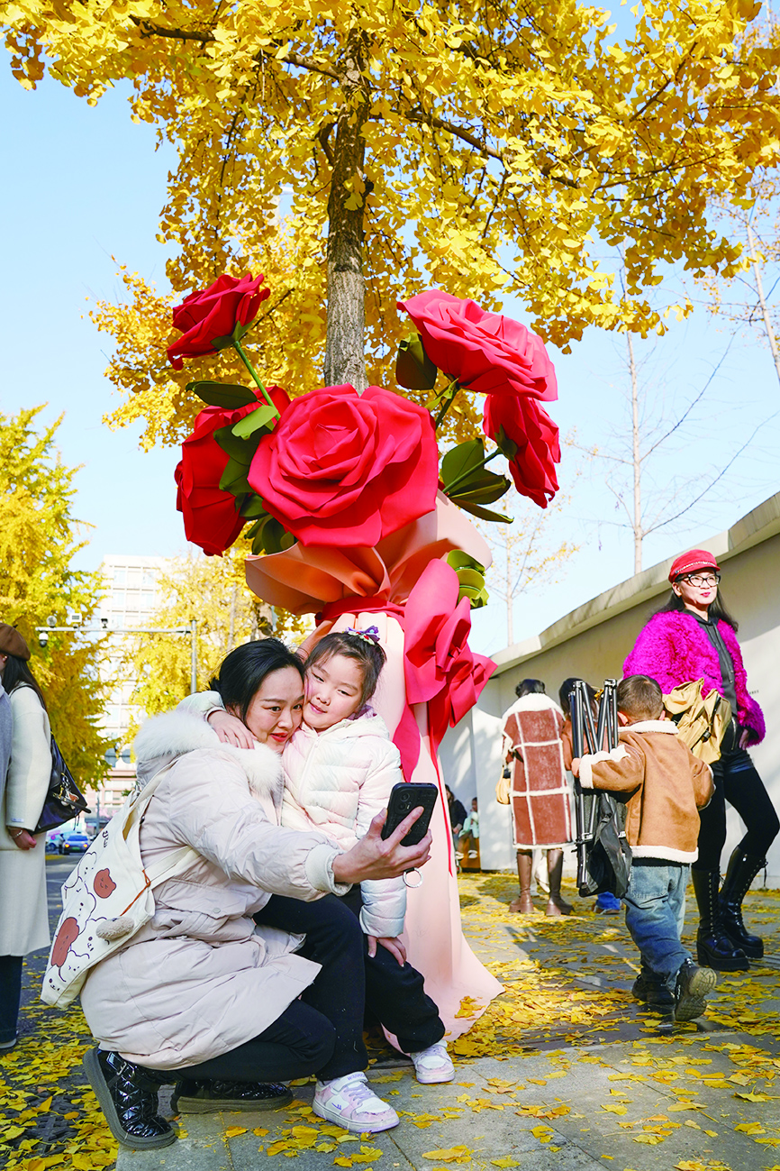 近日,成都街头银杏迎来最佳观赏期。在成都高新区肖家河街道兴蓉社区兴蓉街,居民和志愿者们一起,为路边30多棵银杏树穿上了“毛衣”,缤纷的色彩为冬日带来温暖,吸引了不少市民前来游玩拍照。图为12月14日,一对母女在成都高新区兴蓉街银杏树下合影。 新华社记者 胥冰洁 摄