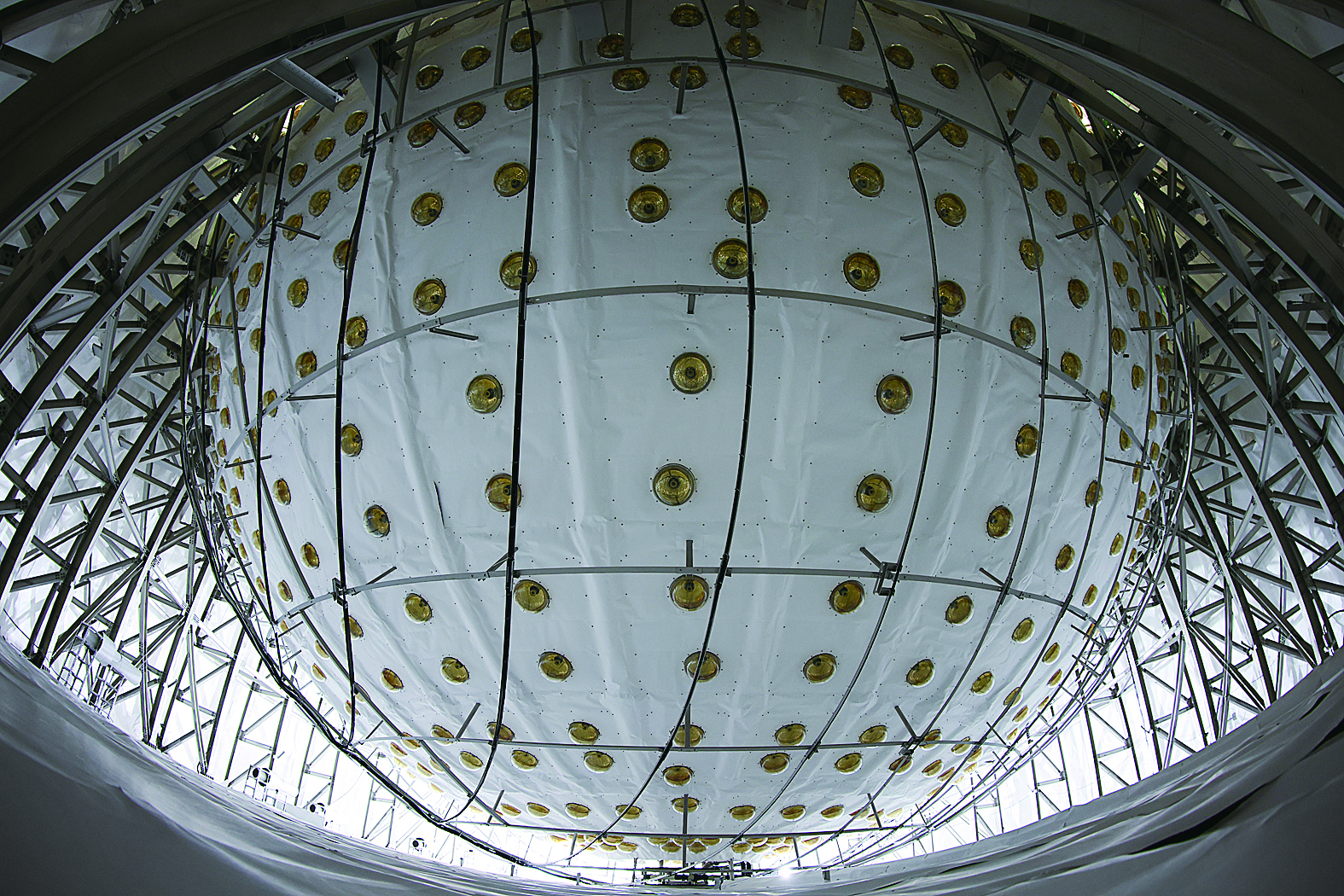 江门中微子实验位于广东江门开平市,它的核心探测设备(中心探测器)是一个有效质量2万吨的液体闪烁体探测器。布满中心探测器内壁的光电倍增管共同探测中微子被液体闪烁体“俘获”时产生的闪烁光,并将光信号转换为电信号输出。