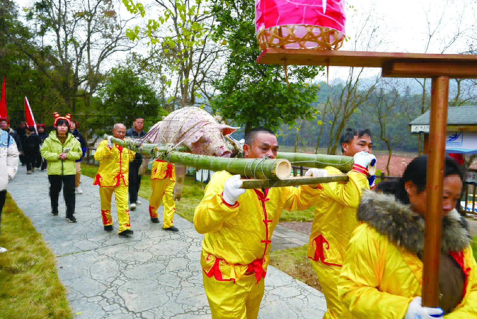 12月21日,攸县酒仙湖景区开展了一场别开生面的抬年猪巡园活动。一头近150公斤的年猪,挂着红缨,由4名壮年男子用竹制的架子抬着,在酒仙湖畔巡游。年猪所到之处,锣鼓欢腾,众多游客纷纷拿出手机拍照。抬年猪是湘东的一大特色年味民俗,寓意喜庆丰收,祈福新年五谷丰登、六畜兴旺、吉祥平安。