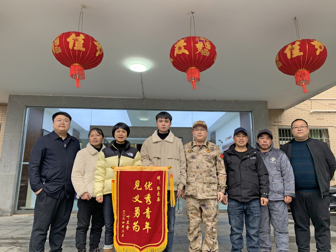 获救家庭向张豪鑫(左3)送上表达心意的锦旗(资料图)。 通讯员供图
