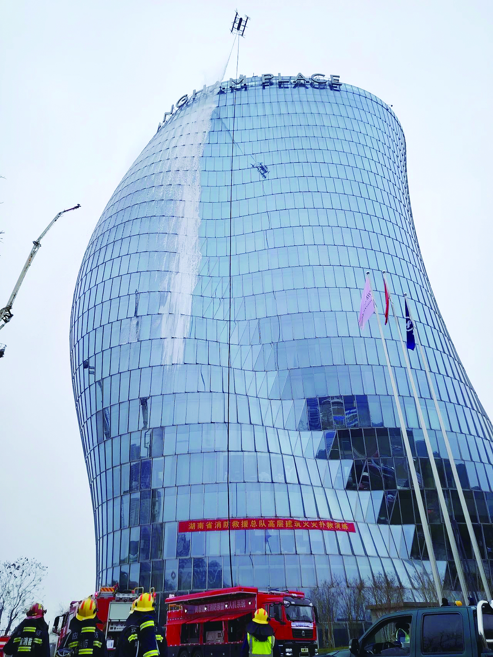 本次演练模拟城市高层建筑火灾应急救援全过程,以“长沙某酒店高层突发火情”为背景,山河星航系留式大载荷无人机系统协同大型直升机、高喷消防车,进行高层建筑火灾扑救。