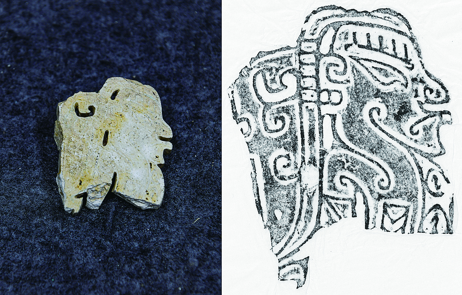 这是一张拼版照片:左图为2024年7月10日在四川省文物考古研究院拍摄的三星堆遗址出土玉石上阳刻的侧身人像;右图为玉石上阳刻的侧身人像拓片。 新华社发