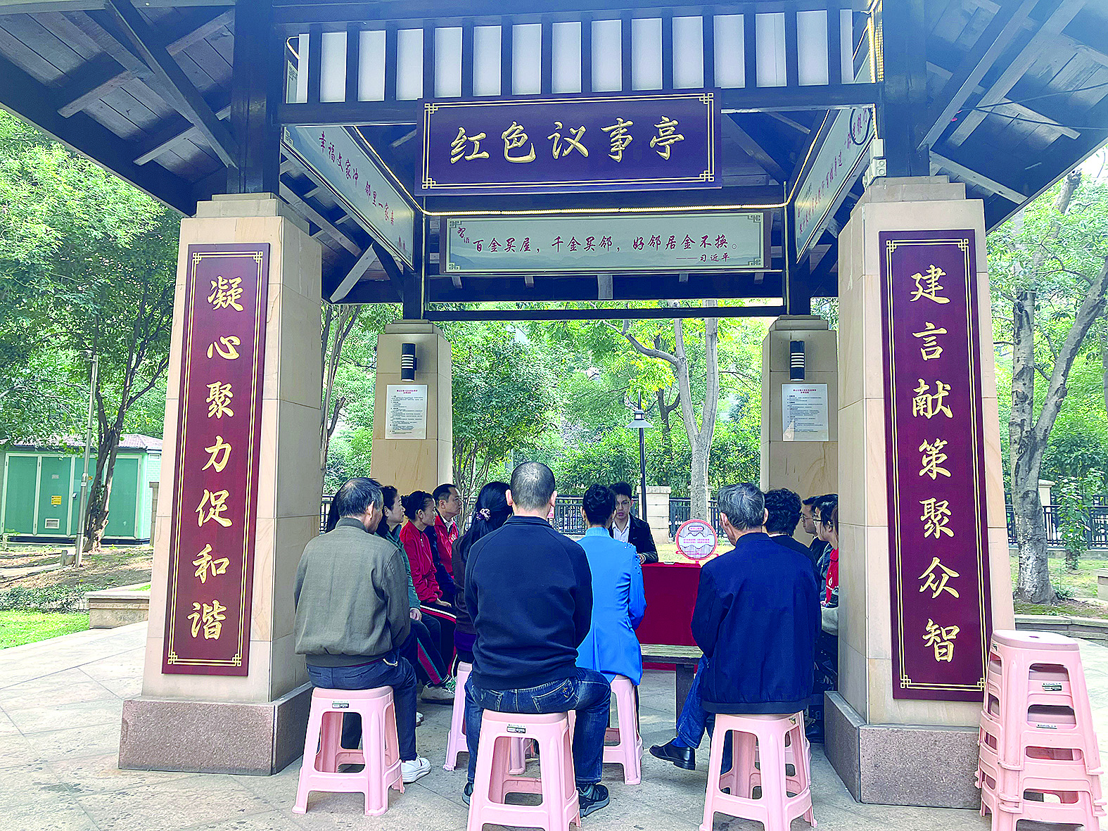 小区居民和志愿者正在红色议事亭商议事务。 记者/姚时美 摄