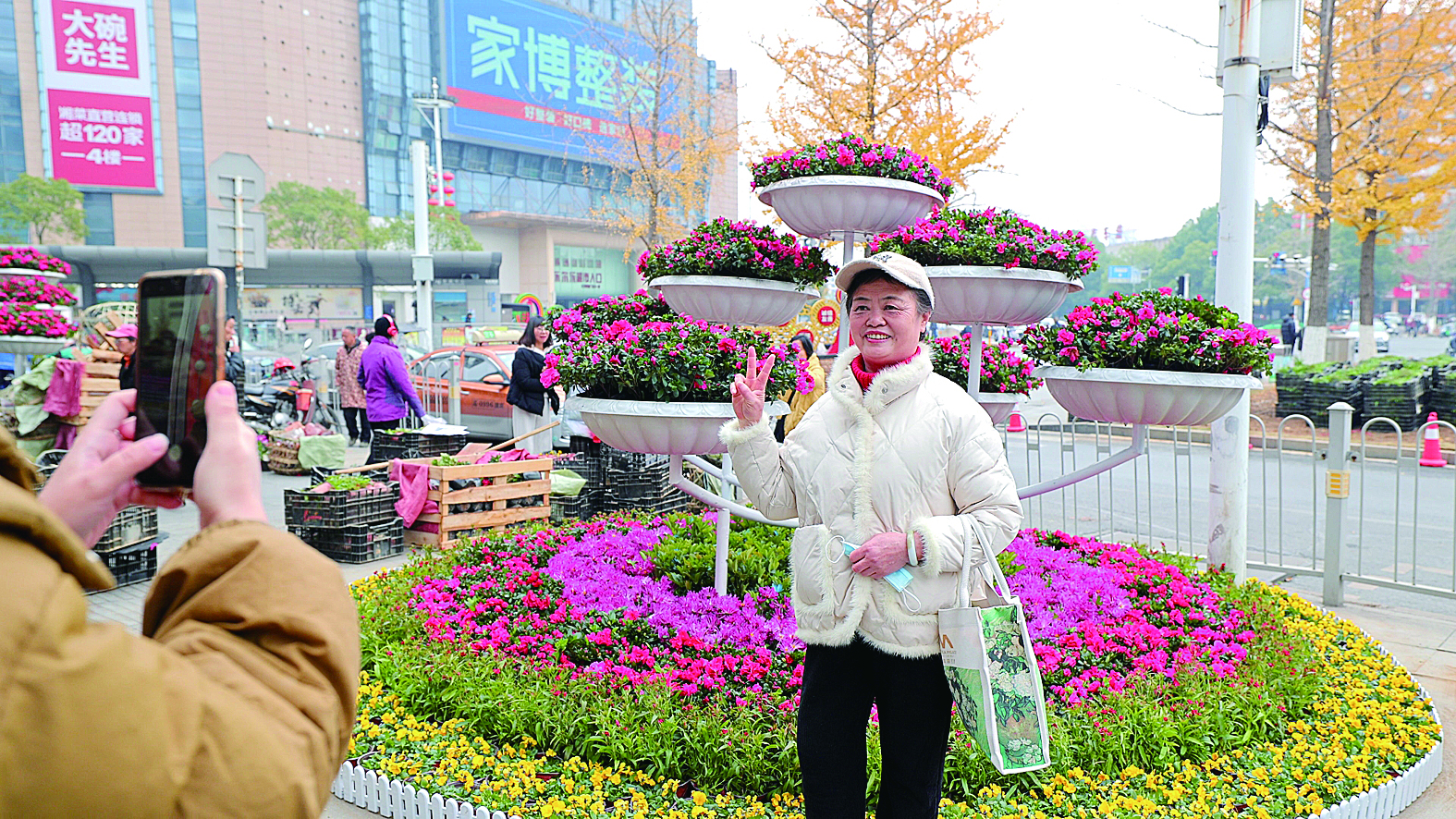 市民正在红旗广场新布置的景观前拍照留念。记者/谭俊杰 摄