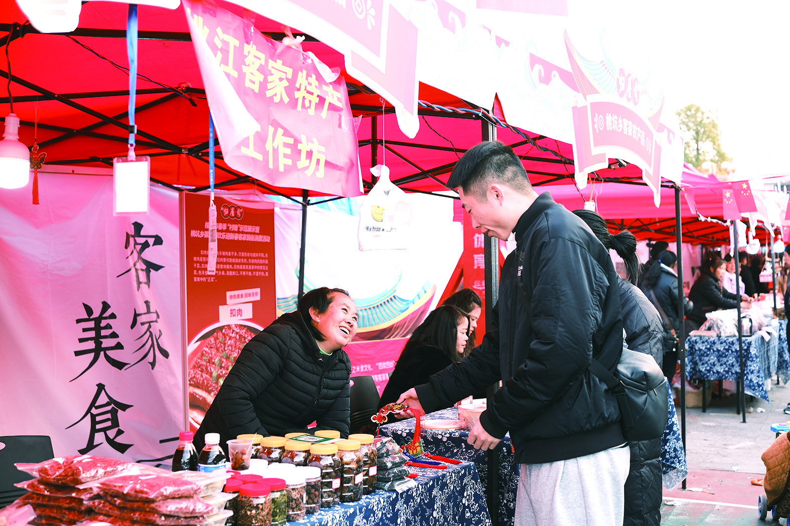 1月1日至9日,在茶陵县虎塘社区广场,桃坑乡举办第二届客家民俗消费活动。现场150余个展位摆满各色年货,特别是酿豆腐、米果、盐辣椒等特色客家美食让人大饱口福。晚上还有打铁花“非遗”表演,铁水在空中洒开,火花四溅,为游客带来一场视觉盛宴。