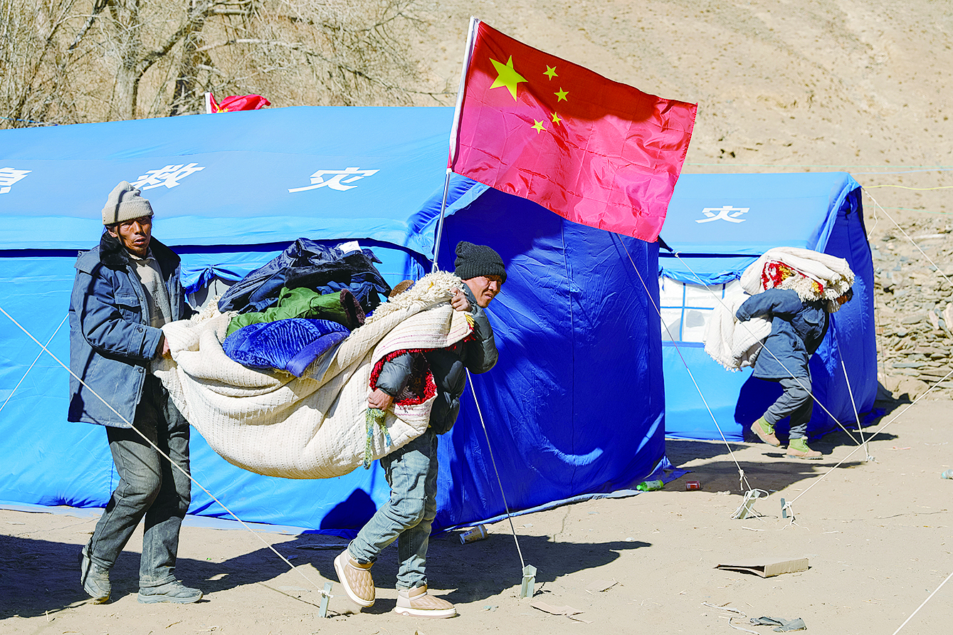 1月10日,在定日县长所乡古荣村,受灾群众将过冬物资从临时安置帐篷搬入板房。 新华社记者 沈伯韩 摄
