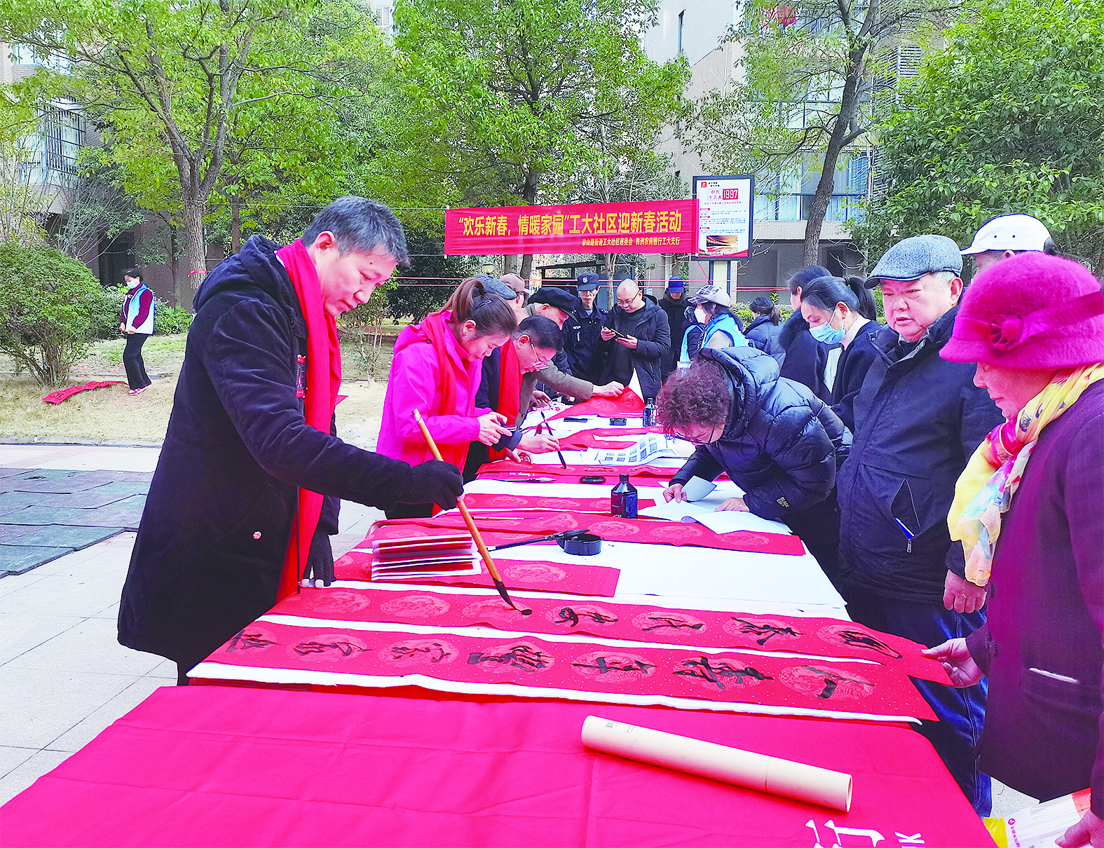 1月14日,天元区泰山路街道工大社区居委会联合株洲农商银行工大支行,在山水文园小区精心筹备了“欢乐新春 情暖家园”迎新春活动。现场洋溢着浓郁的节日氛围,数位书法老师现场挥毫泼墨,笔锋游走间,一副副对仗工整、寓意吉祥的春联和一个个饱含神韵的“福”字跃然纸上。居民们围聚四周,挑选心仪的作品,将新春的祝福与美好期许带回家。