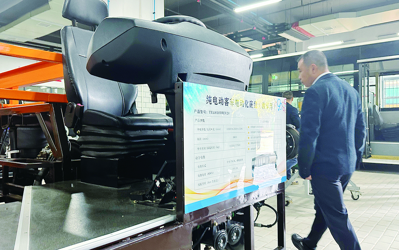 湖南汽车工程职业大学校内的电动客车底盘教学模型。 记者/戴凛 摄