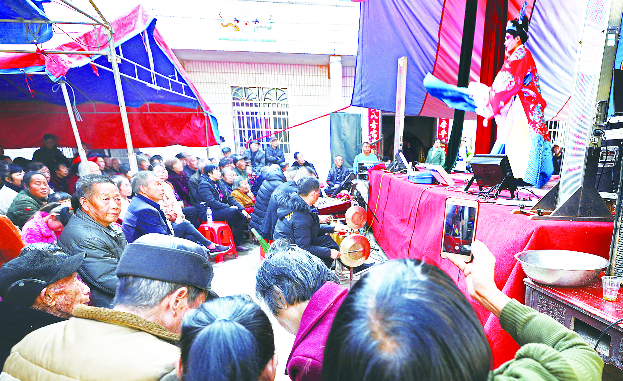 这是渌口区龙门镇太湖村的一场湘东路子花鼓戏,台上唱念做打,精彩不断。台下阵阵叫好,热情洋溢。