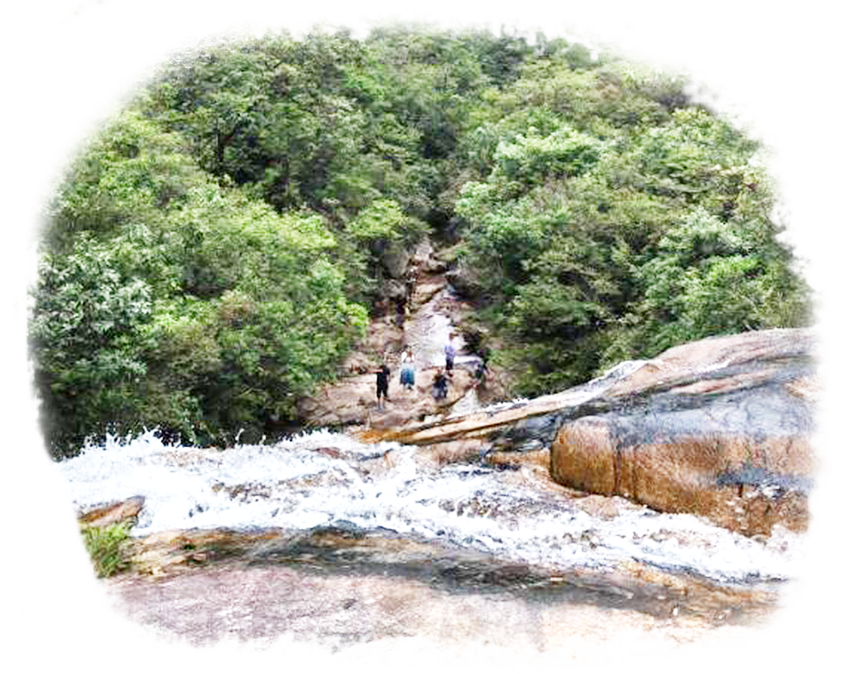 溯溪而上,溪水在元宝石上面的岩窝里回环成一池清潭。而与白色珠玉相连的,是一脉素练,转折飘动于一道三尺来宽三丈余长的岩沟之中。岩沟的末端,树木掩映之处,溪流从四级台阶上次第泻下,喧腾出一片哗哗啦啦的浑厚歌咏,然后才轻歌曼舞地缠向元宝石。这一道瀑布,人们称之为“元宝瀑”,它不仅仅是一道自然景观,更是大自然赋予这片土地的一份珍贵礼物。我站在瀑布之下,任由水雾轻拂脸颊,感受着大自然的神奇与伟大。我想,这瀑布,这岩石,这溪水,都是时间的见证者,见证了无数个春秋的更迭,见证了生命的轮回与成长。而我,作为一个匆匆过客,能够在这短暂的时光里,与它们相遇,感受它们的存在,这本身就是一种莫大的幸福。