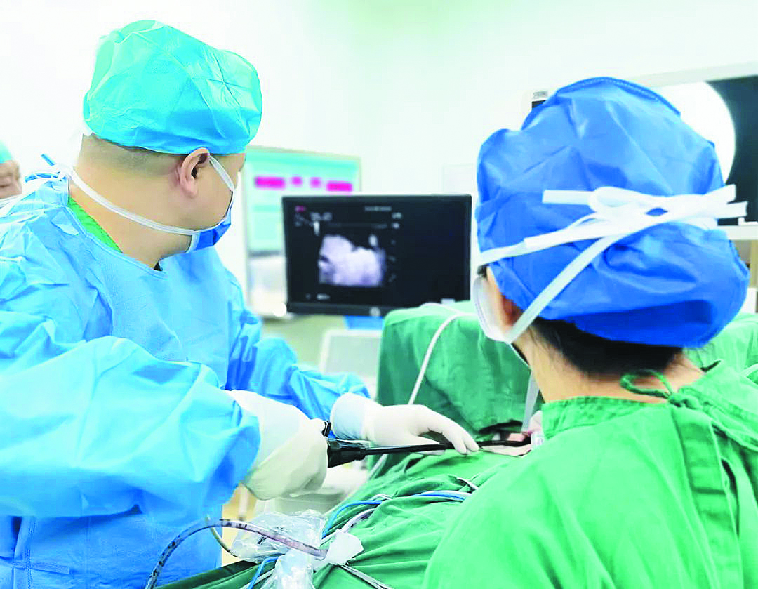 医生为李女士行腹腔镜下术中超声。 通讯员供图