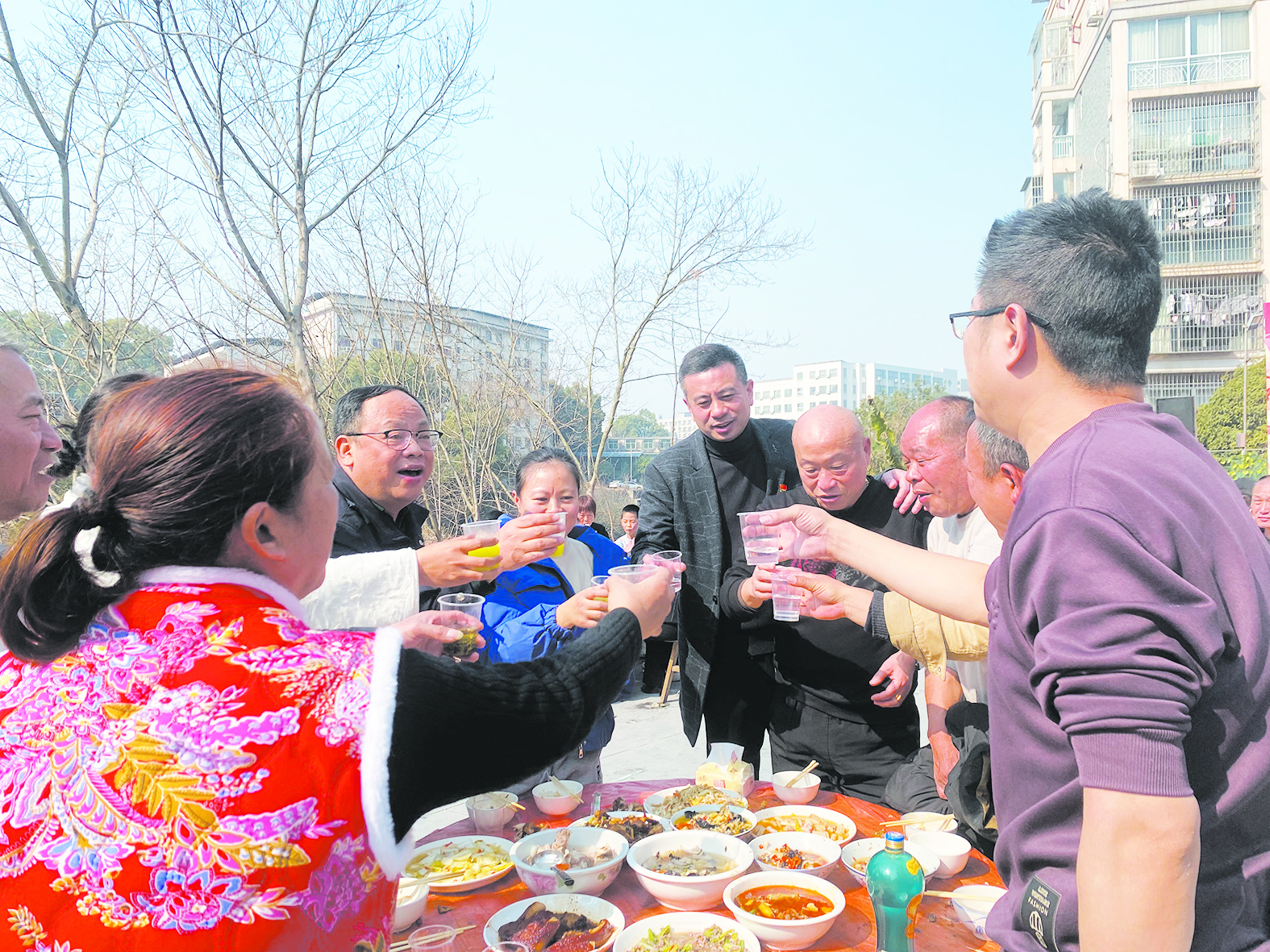 1月19日,荷塘区海德堡小区团年饭上,邻里之间相互碰杯。记者/旷昆红 摄