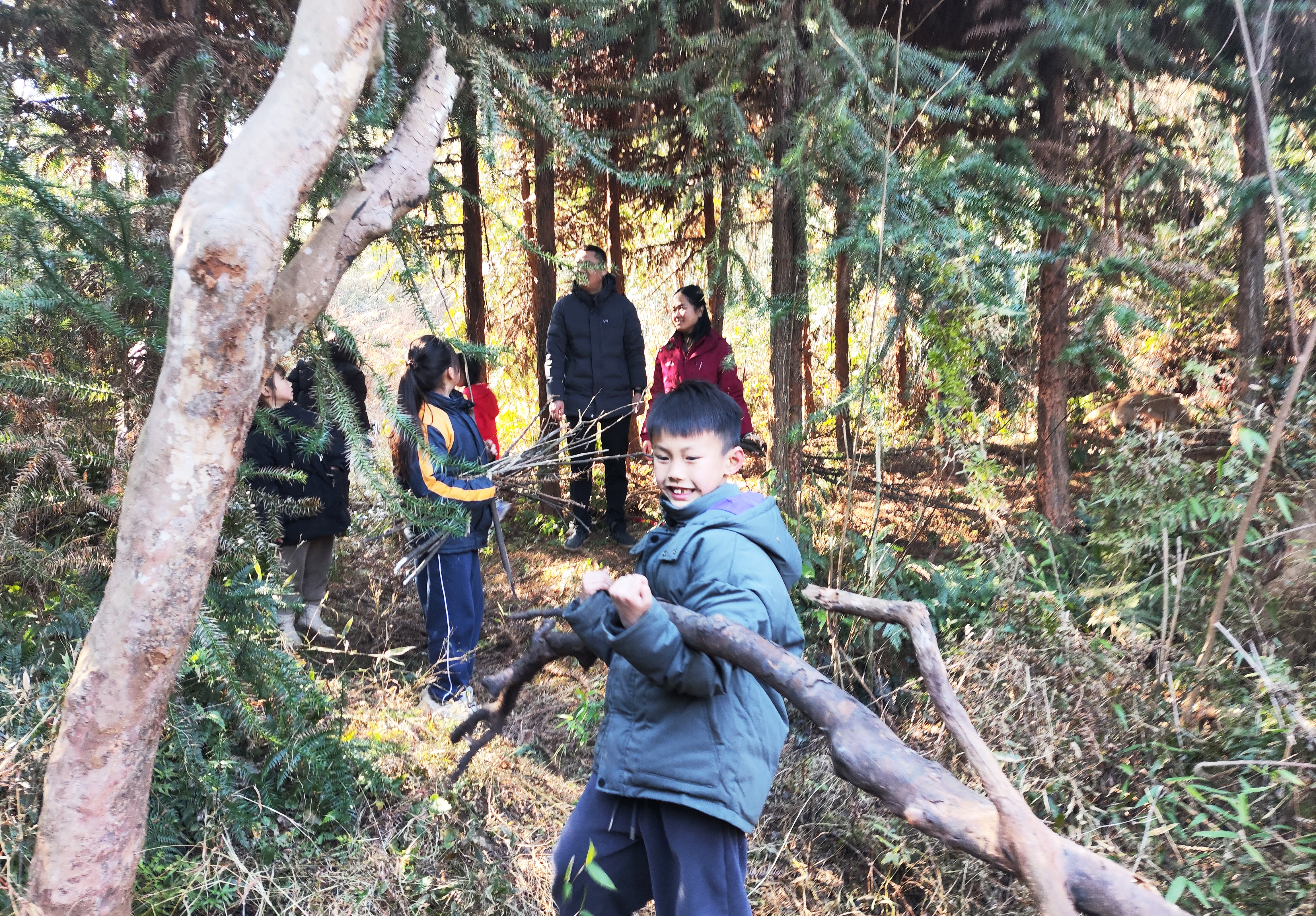 家长与孩子齐声诵读《新年贺词》《少年中国说》《增广贤文》《卖炭翁》等经典篇章,在朗朗书声中感受传统文化的魅力。随后在社工的带领下上山伐薪,大家兴高采烈地走进山林,家长砍柴,小朋友们捡拾干柴,然后一起把柴扎成捆,在亲子协作过程中,共同感受劳动的快乐。