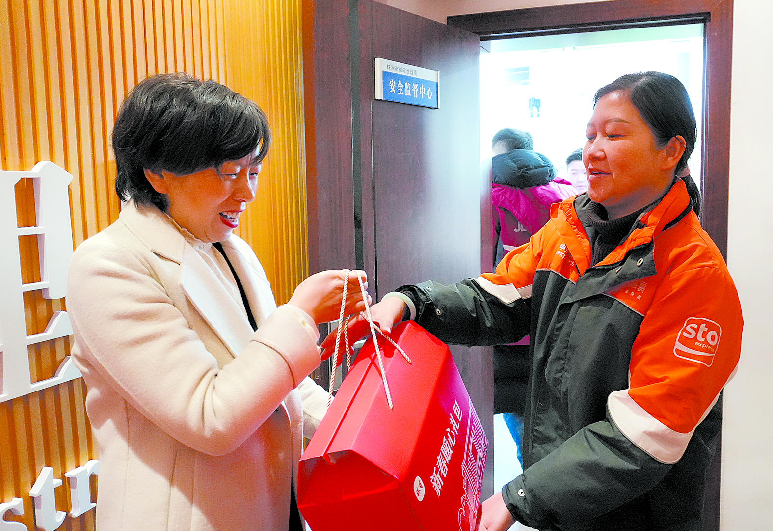 株洲百货股份有限公司相关负责人(左)为快递行业员工送去新春礼包。 记者/易楚曈 摄