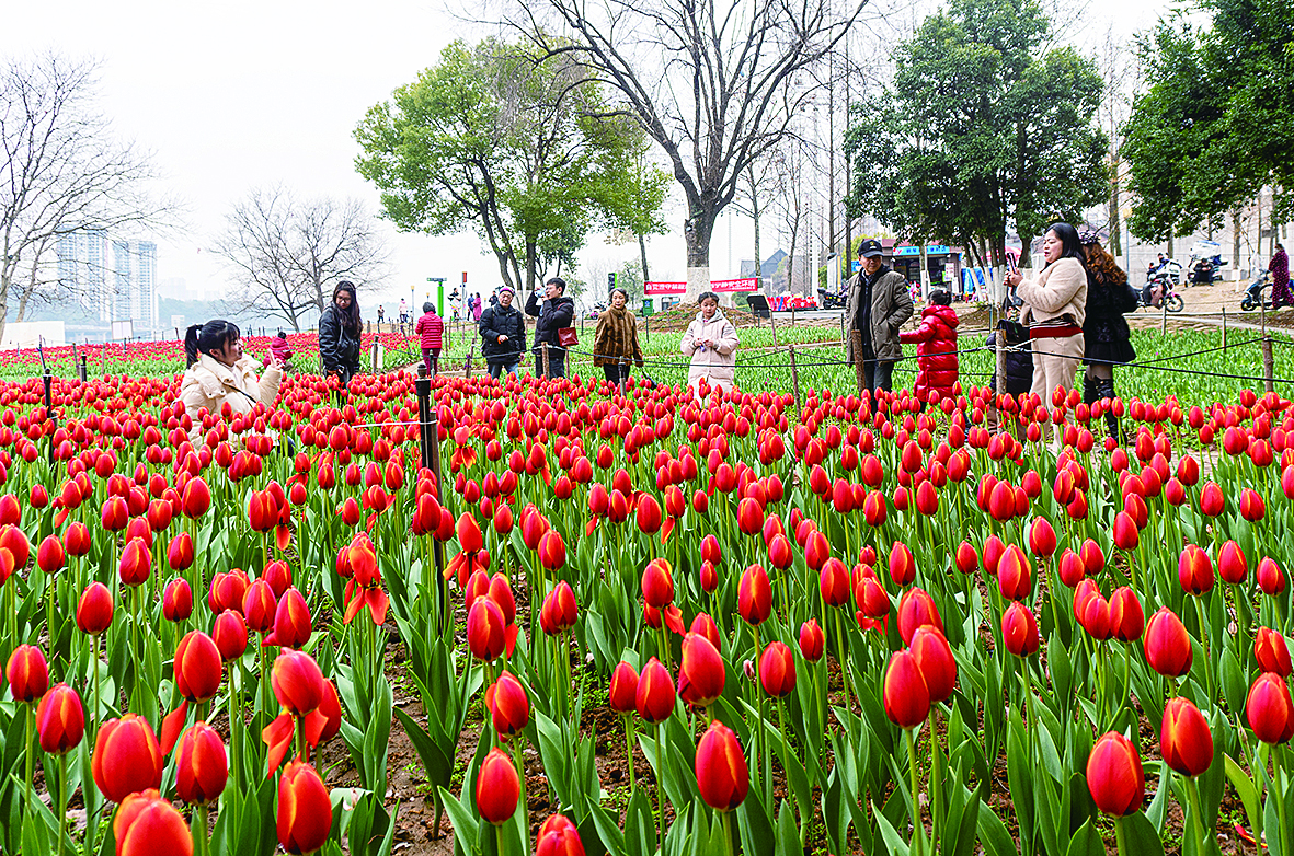 早春时节,人们踏青游玩,亲近自然,乐享春光。2月5日,在河西湘江风光带钢琴广场,市民们在郁金香花海旁打卡拍照。