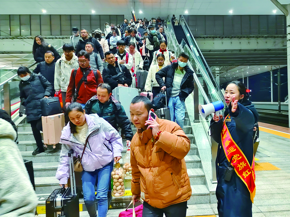 快速穿梭在人流之中,车站党员突击队成员唐晓庆一边引导到达旅客往出站口方向移动,一边大声提示须换乘的239名旅客,可经临时开放的一楼候车大厅转入二楼候车,避免天桥廊道的拥堵。
