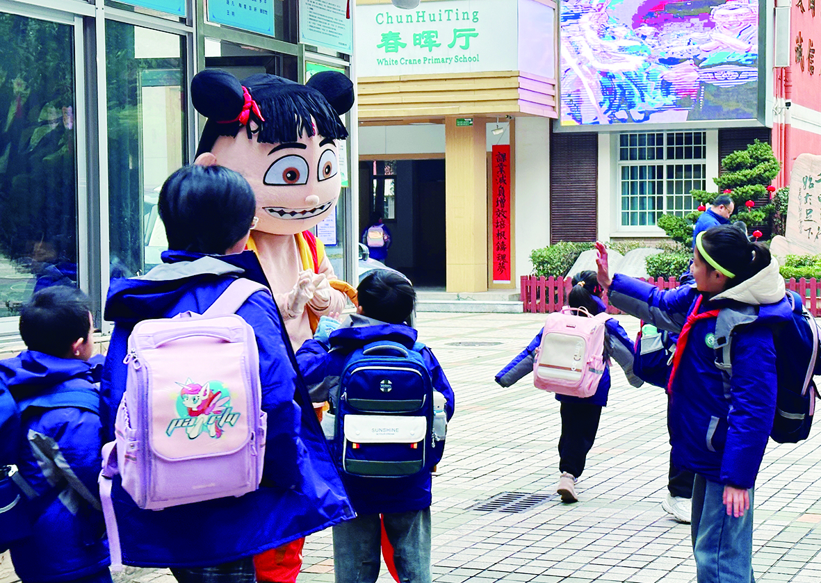 白鹤小学门前,学生和哪吒人偶互道祝福。 株洲日报全媒体记者/戴凛 摄