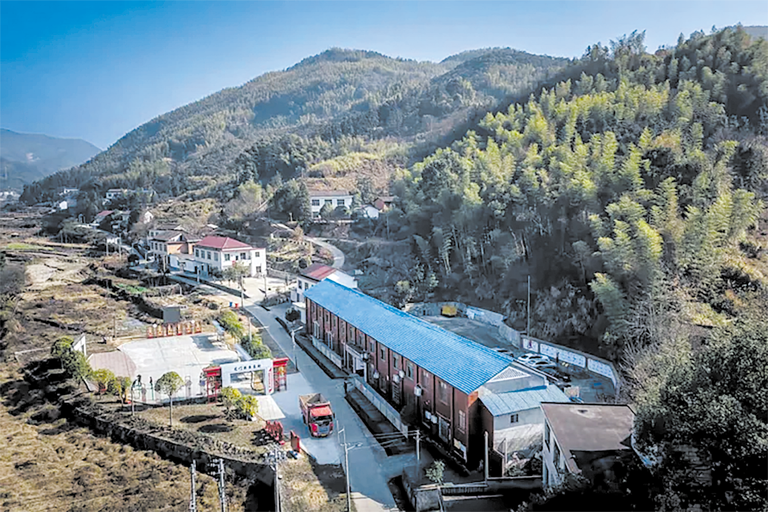 村庄卧在幽深峡谷间,浸染两边山峦淌溢而下的浓翠。屋舍多为新盖,三三两两,一律素淡粉墙,屋顶瓦片却或红或蓝或灰,各展风姿,也彰显着主人的雅好。小溪恬然横于谷底,清冽如镜,盛满天光云影,蟒蛇一般蜿蜒而前,缓缓没入峡谷尽头。一条与小溪平行的水泥村道平整而洁净,侧身穿过屋前晒谷坪、村部休闲广场,又顺山脚消隐在了葱绿间。