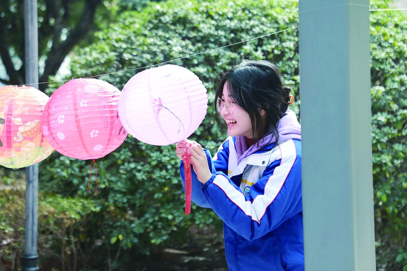 名师长廊和杏园广场道路两旁,五彩灯笼高高挂起,像含苞的花朵;谜语纸条随风飘舞,招摇着,吸引学生们驻足。400个灯谜内容涵盖科学、文化、艺术、生活常识等多个领域,难度适中,既有趣味性又有挑战性。