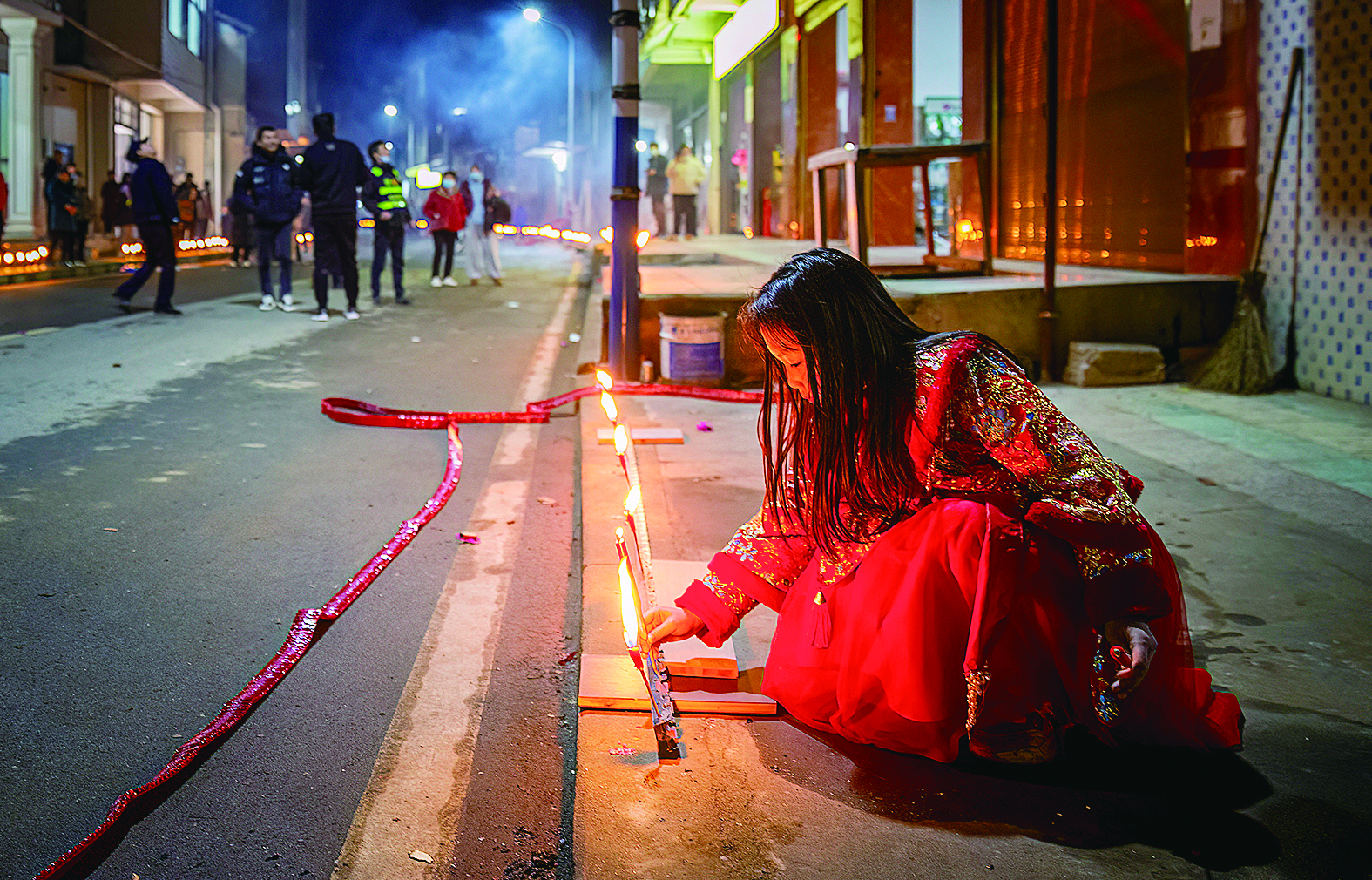 街道两旁人们点起蜡烛接龙。陈向东 摄