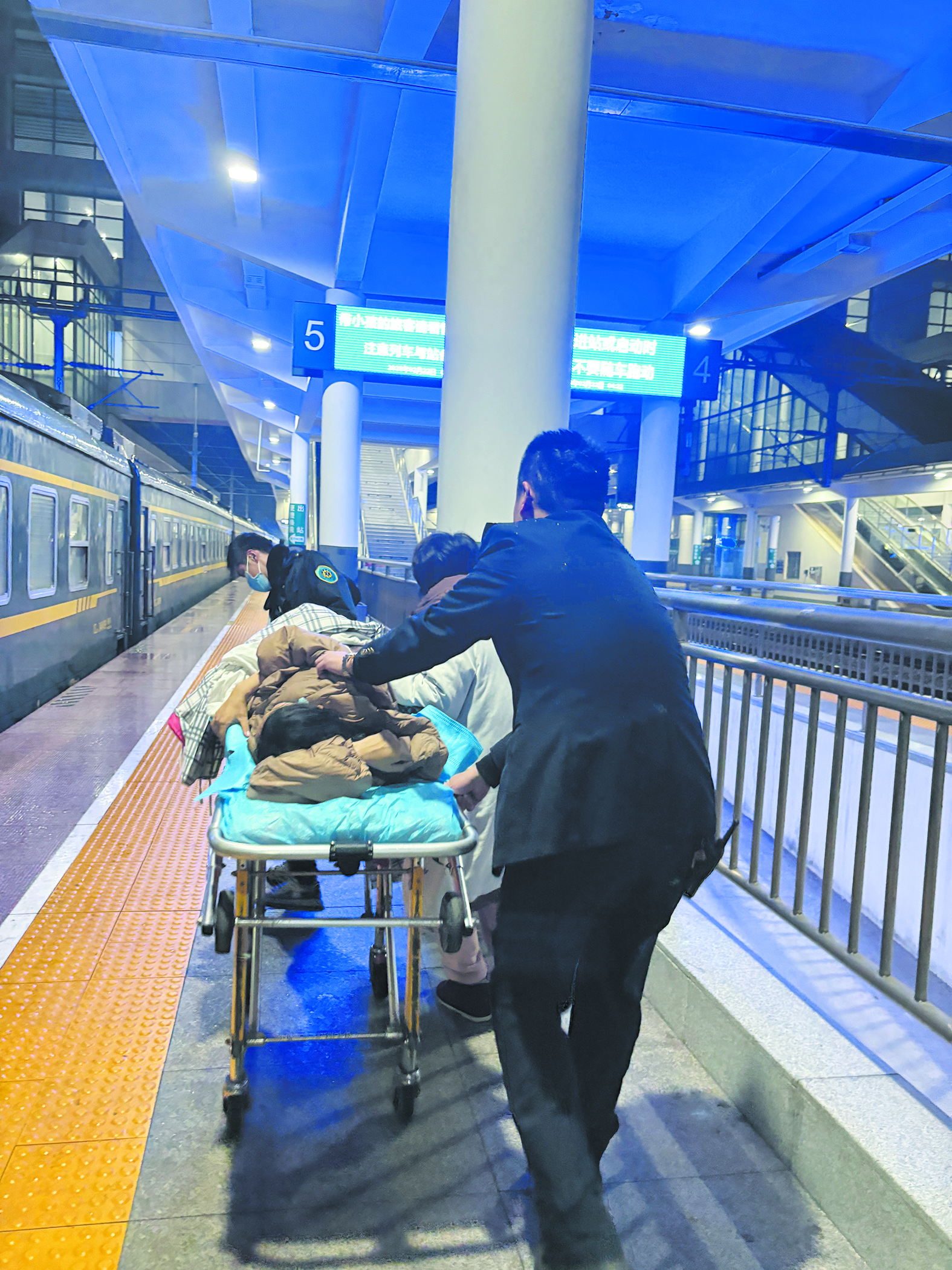 情况紧急,在K1557次本站不办理营业的情况下,安大磊紧急启动春运应急预案,确认列车停靠位置和到站时间后,马上组织站台安全员陈深根、客运员刘嘉琪和女客运员胡思敏携带救助用品等设备,在相应站台列车停靠车厢位置待命,广播室进行全站范围内的广播寻医。