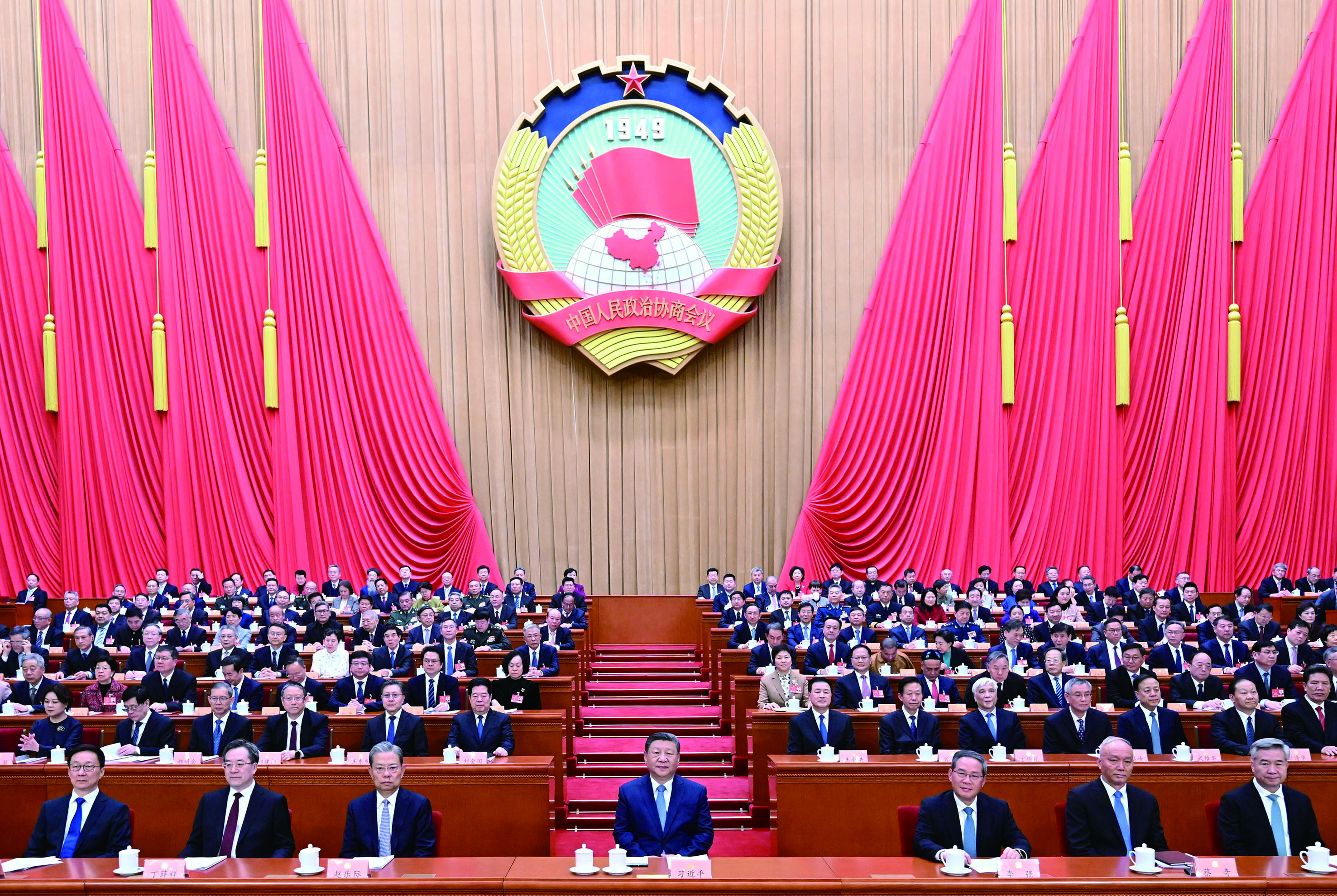3月4日下午,中国人民政治协商会议第十四届全国委员会第三次会议在北京人民大会堂开幕。这是习近平、李强、赵乐际、蔡奇、丁薛祥、李希、韩正在主席台就座。 新华社记者 谢环驰 摄