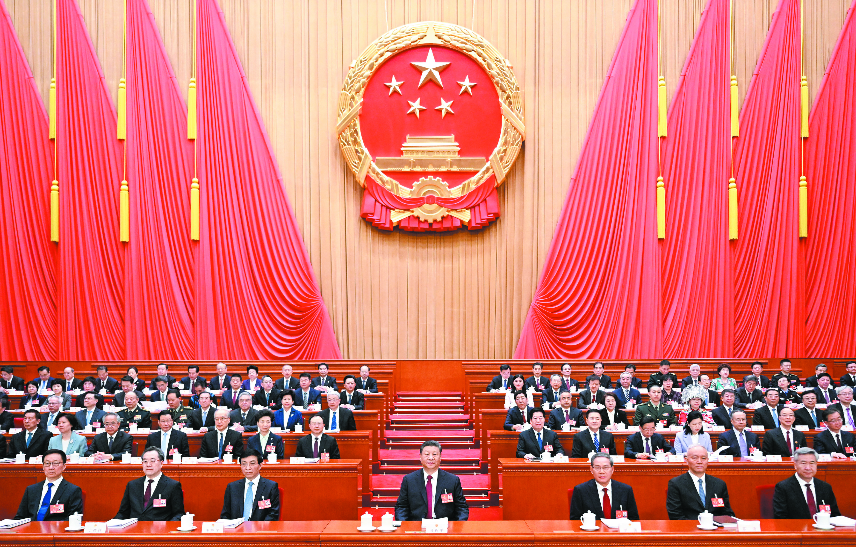 人民大会堂大礼堂气氛庄重热烈,主席台帷幕正中的国徽与会场穹顶上的五角星灯交相辉映。