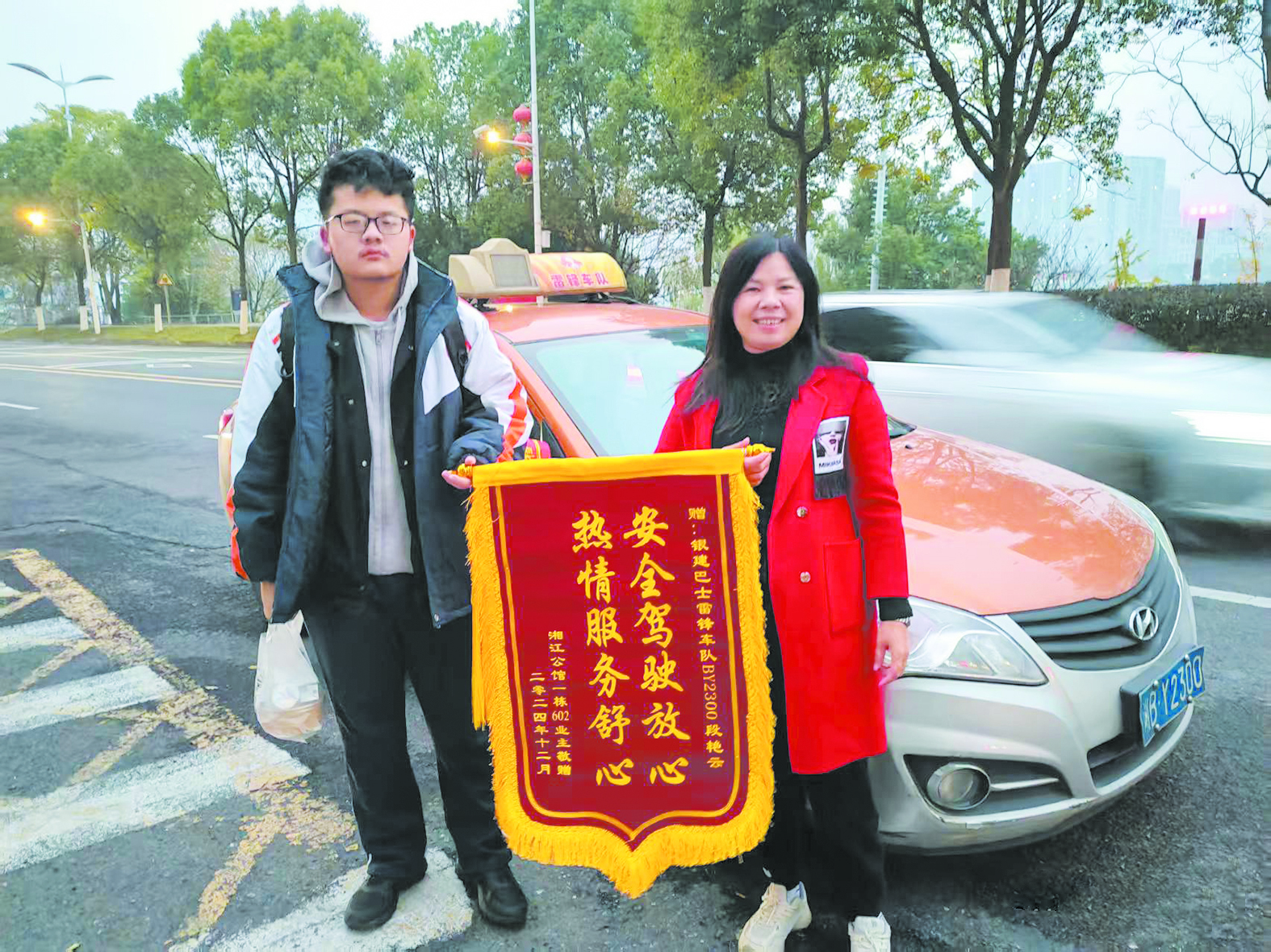 一面锦旗,见证了“的姐”段艳云每日清晨风雨无阻护送高二学子到校的温情故事。 受访者供图