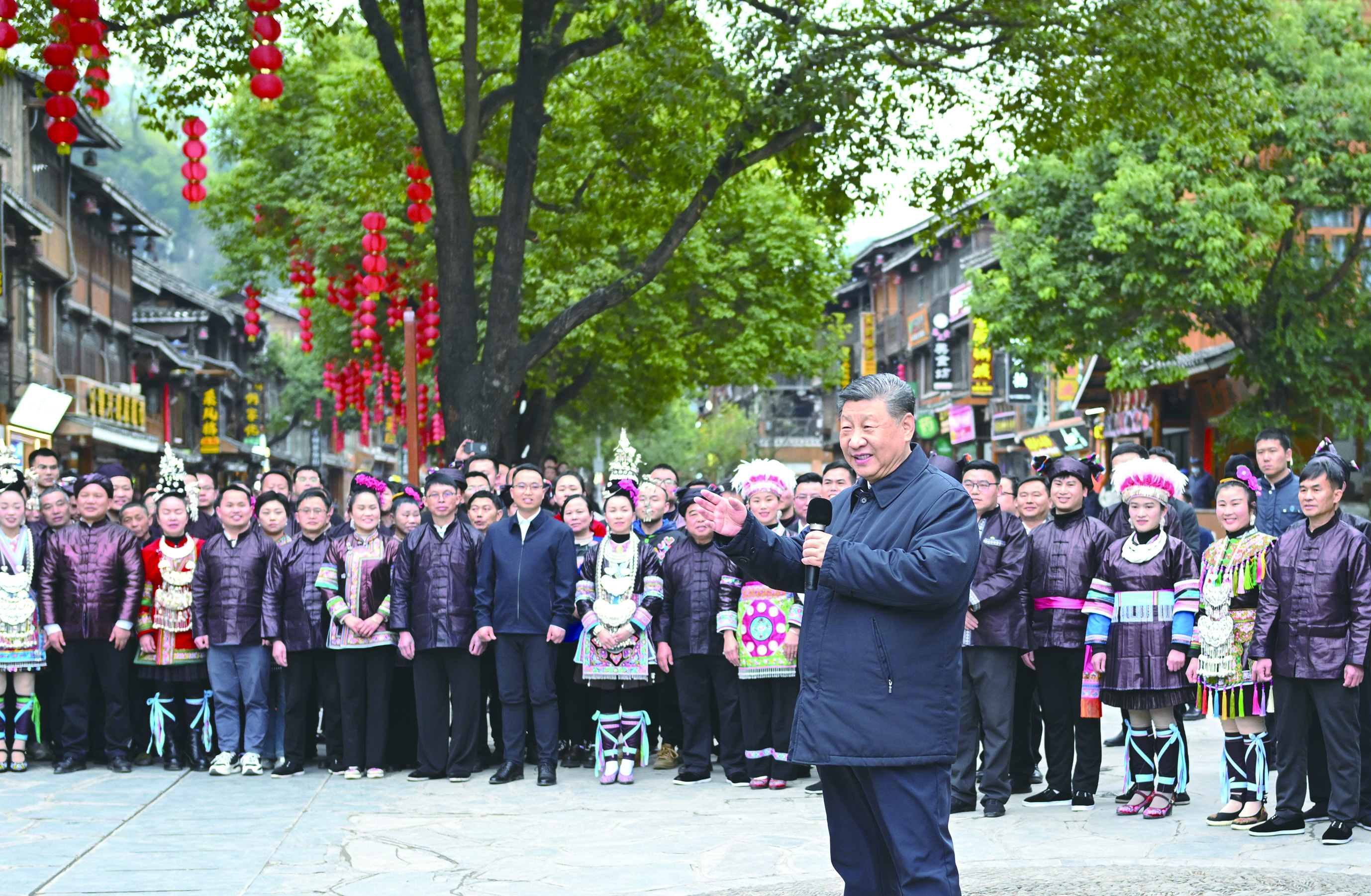 这是17日下午,习近平在黔东南州黎平县肇兴侗寨考察时,同村民们亲切交流。 新华社记者 燕雁 摄