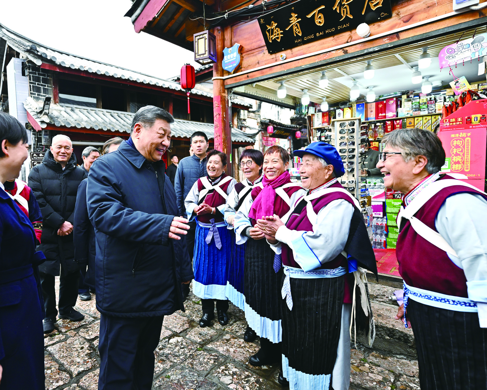 丽江古城有800多年历史,被列入世界文化遗产名录。一场春雪过后,丽江游人如织。习近平来到这里,详细了解古城营建历史、纳西族民居特色和当地文化遗产保护利用、推动文旅融合发展等情况。居民和游客见到总书记十分兴奋,争相问好,有的还弹奏乐器、载歌载舞欢迎总书记。习近平频频与大家互动交流,了解商铺经营状况和游客感受。他要求当地处理好保护和发展的关系,让这座美丽的古城焕发新的光彩。