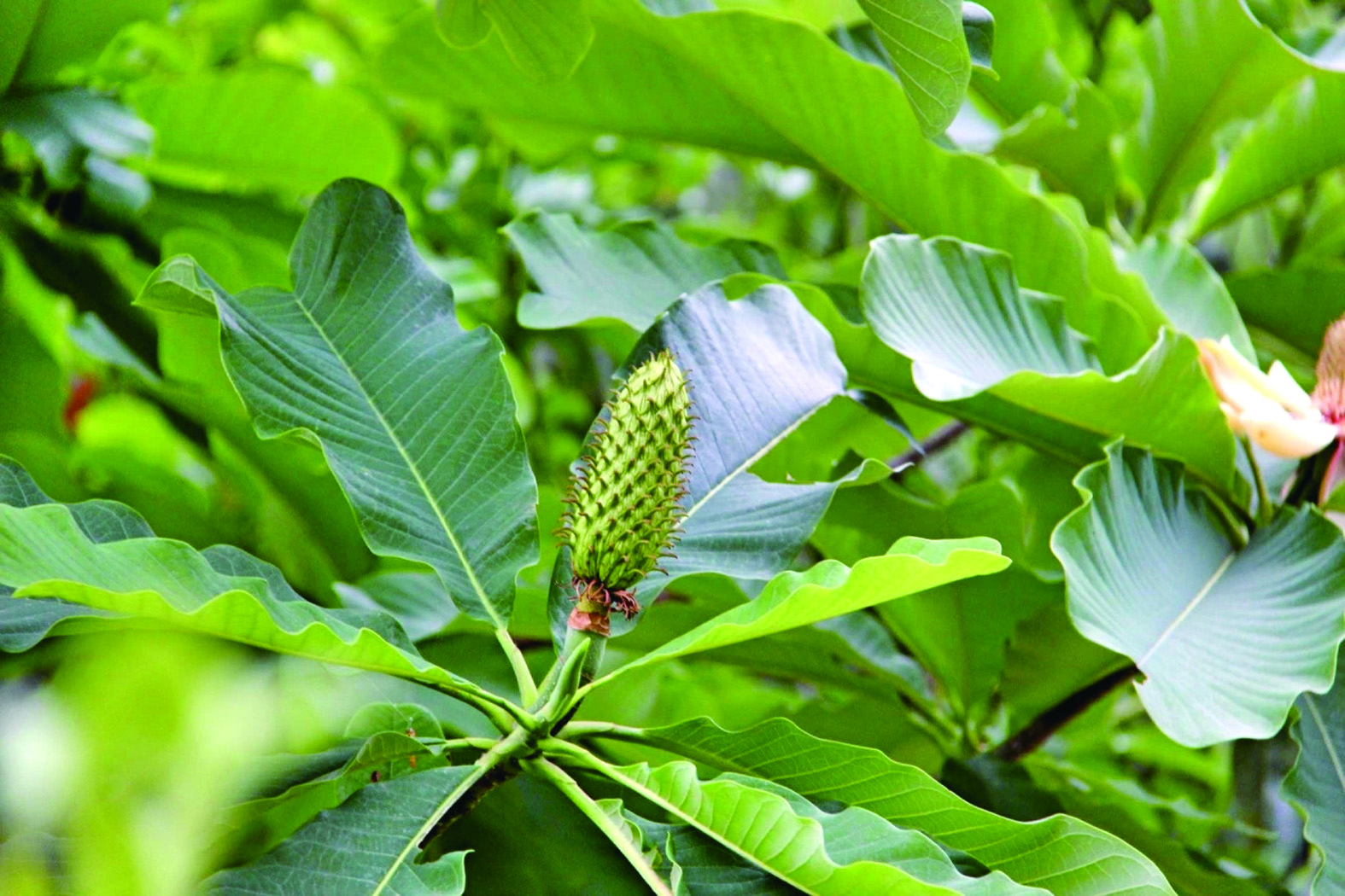 厚朴的叶片巨大,长可达45厘米,宽24厘米,呈长圆状倒卵形,革质坚硬。叶片聚生于枝端,远观如山林中一把撑开的绿伞。叶背灰绿色,覆有白粉和柔毛,雨后更显油亮。