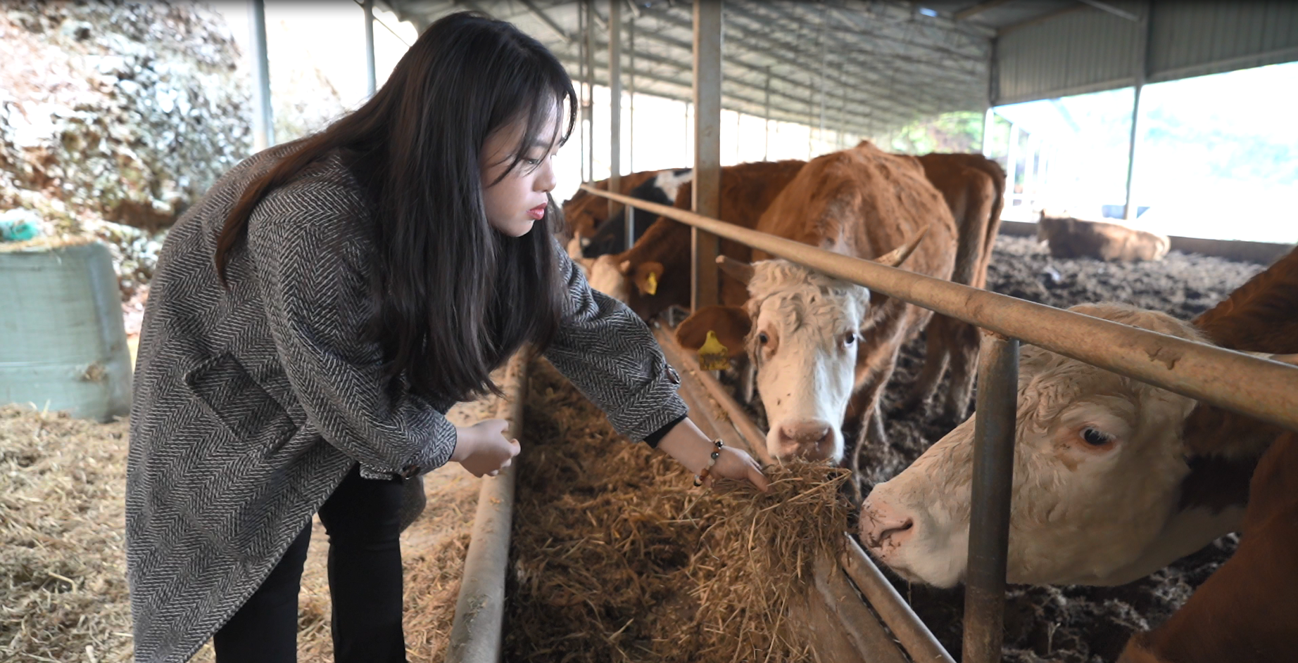 曾齐怡馨在公司养殖场喂养黄牛。 受访者/供图
