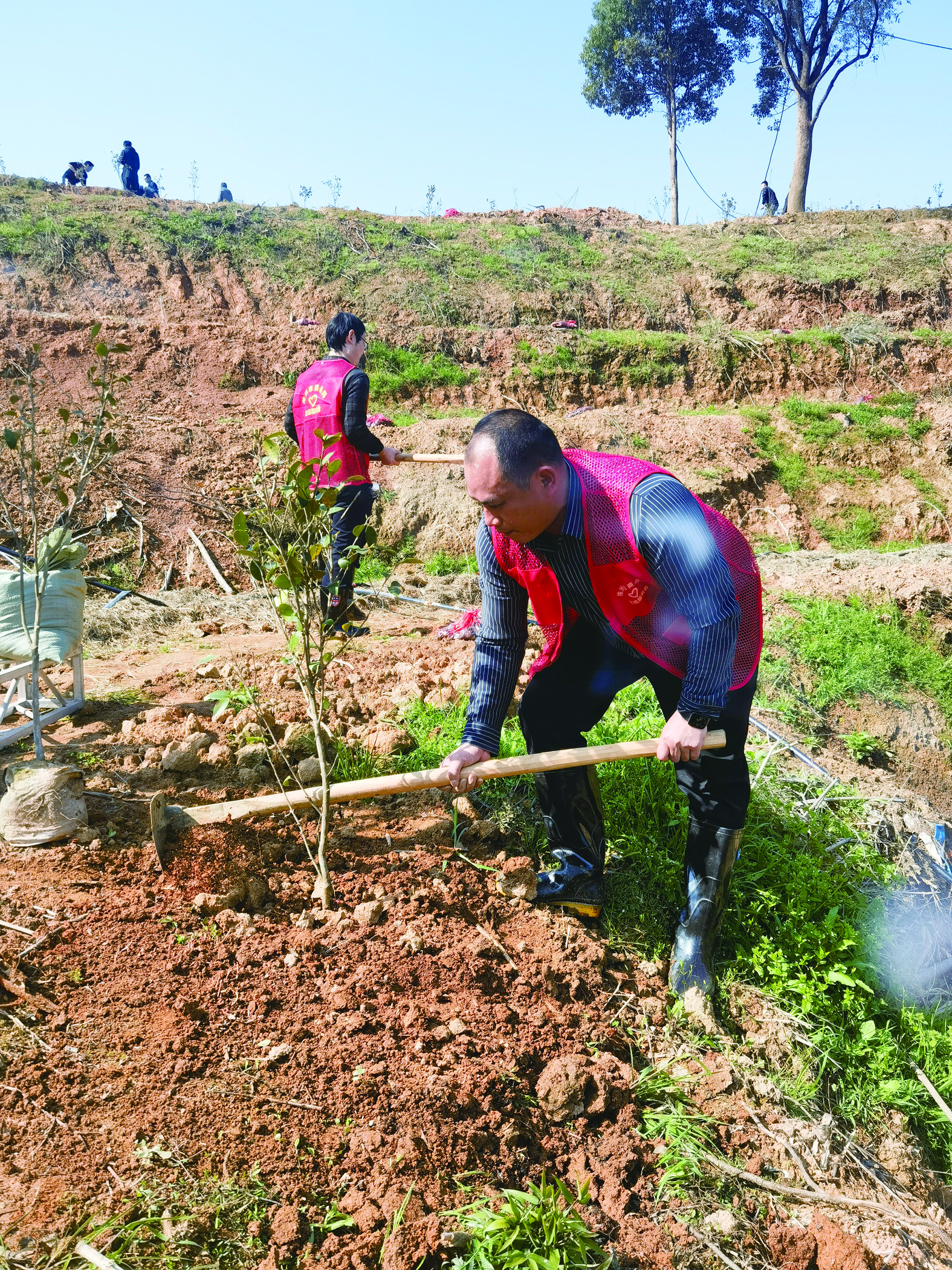 手持铁锹、树苗,志愿者们早早抵达新城村山头,满怀热情地投入到充“植”行动中。来自市商务局的陈志光,作为一名连续三年参加植树活动的“老兵”,从挖坑、栽苗到培土回填,每一个环节都有条不紊,迅速种下6株树苗后,又去指导初次参加活动的新人。