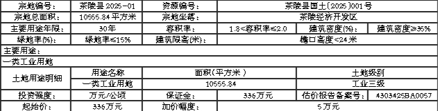 茶陵县2025-01:1、竞得人应在成交确认书签订并完成土地出让成交公示后,10个工作日内签订出让合同。2、竞买意向单位在竞买过程中应对本宗土地进行实地勘踏,并完全知晓土地现状情况,对按现状交地无异议。3、竞得人须严格按照2025年3月14日出具的《茶陵县工业大道与株洲路交汇处西南角宗地规划条件通知书》(茶规通〔2025〕1号)内容和茶陵县国土空间规划专题会议2025年第1次会议纪要相关精神实施。4、由茶陵县自然资源局土地储备中心按现状条件交地,并承担因交地产生的相关法律责任,其他有关事宜按茶陵县国土空间规划专题会议2025年第1次会议纪要相关精神实施。5、该宗地以标准地供地,固定资产投入强度≥216万元/亩、地均收入≥400万元/亩、地均税收≥17万元/亩。