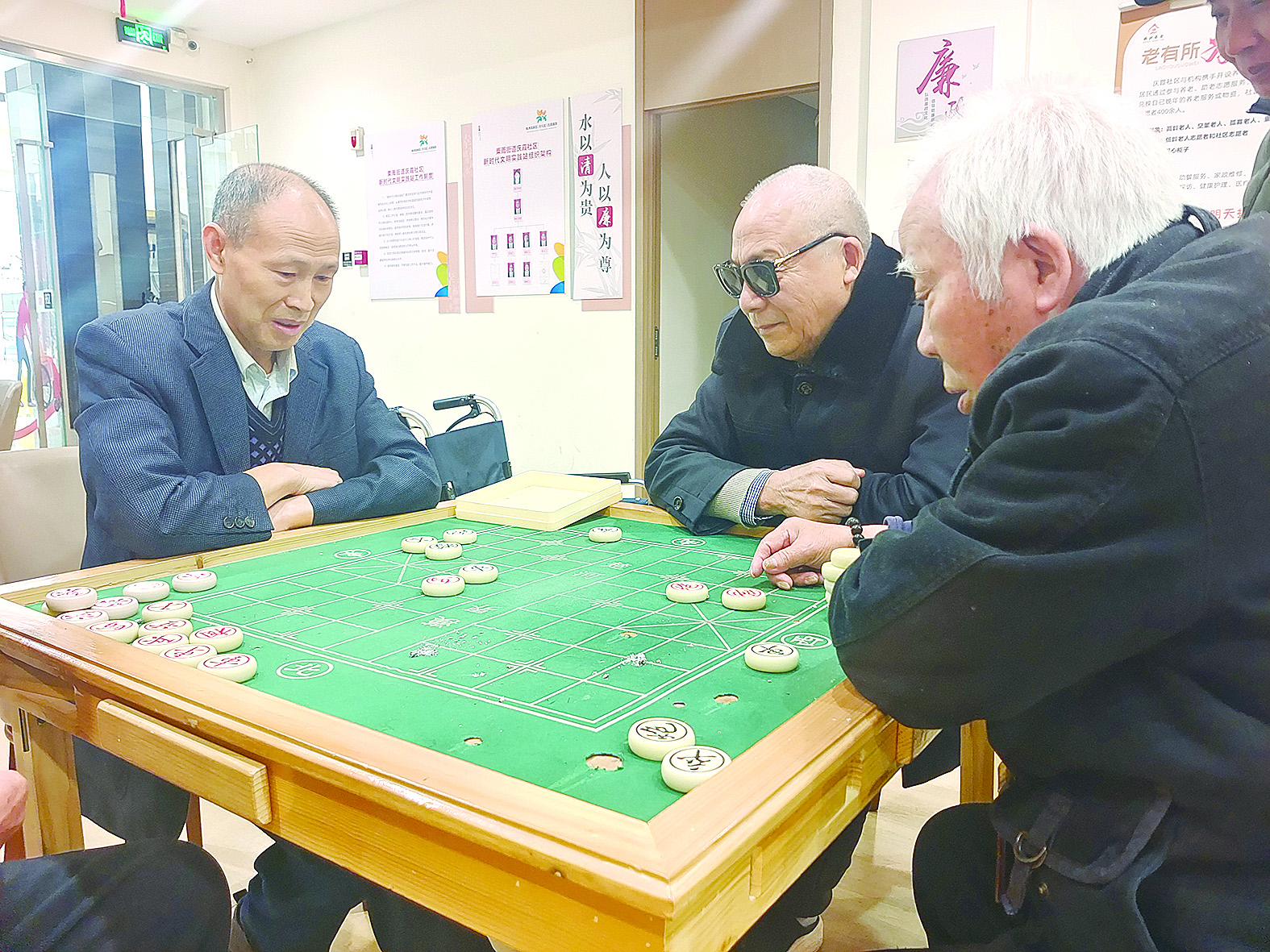 天元区庆霞社区睦邻文化中心,几名退休人员在下象棋。 记者/何春林 摄
