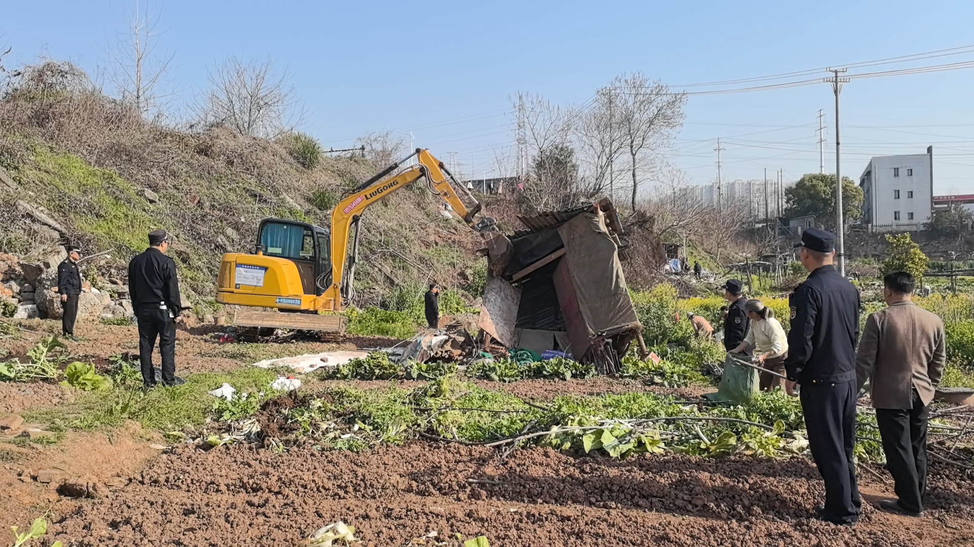 当日,城管、公安、街道等多部门组成60人联合工作组,调用两台专业设备对石峰大桥下违规菜地、乱搭乱建、乱堆乱放进行全面清理。针对正在收尾的菜地,执法队员主动协助居民完成采收,尽显温度执法。行动共清理菜地6000余平方米、拆除私建菜棚等构筑物40处,清运各类堆放物10余处。