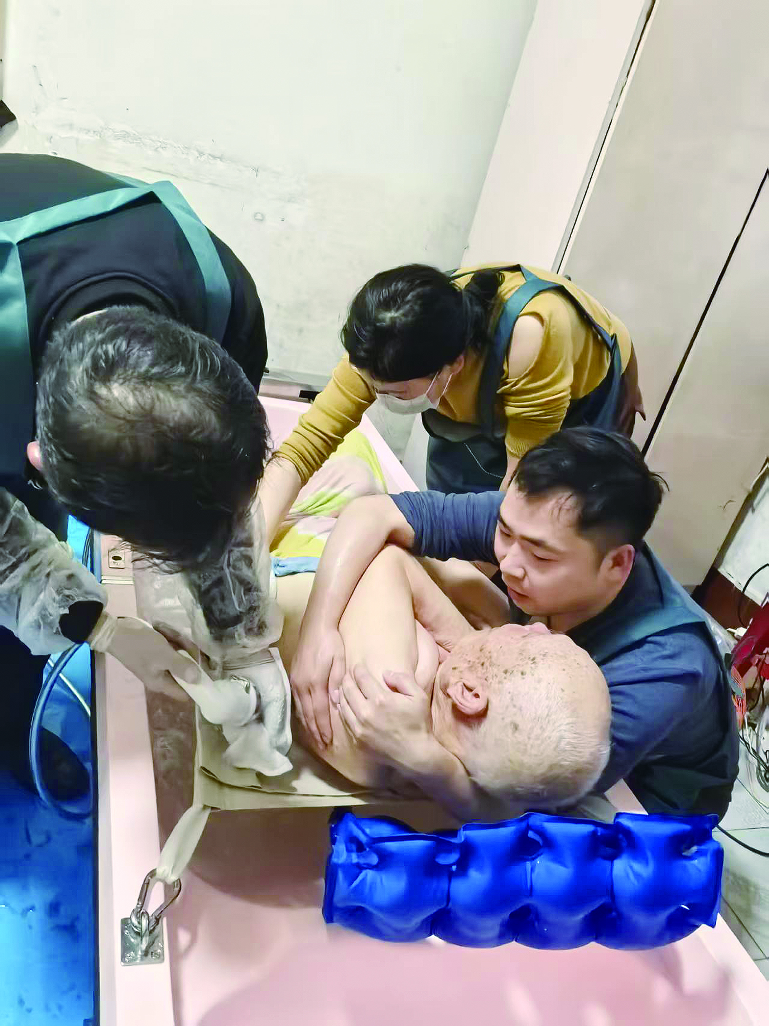 李振兴(右一)和团队为老人上门洗澡。 记者/赖杰琦 摄