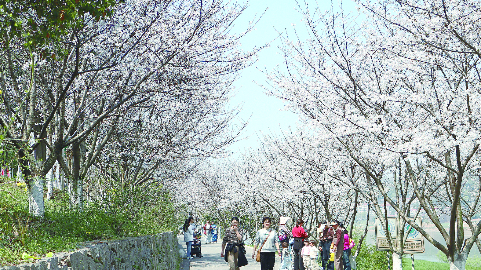 3月24日,河西湘江风光带芦淞大桥(五桥)以北的樱花正盛开,吸引许多市民前来休闲打卡。