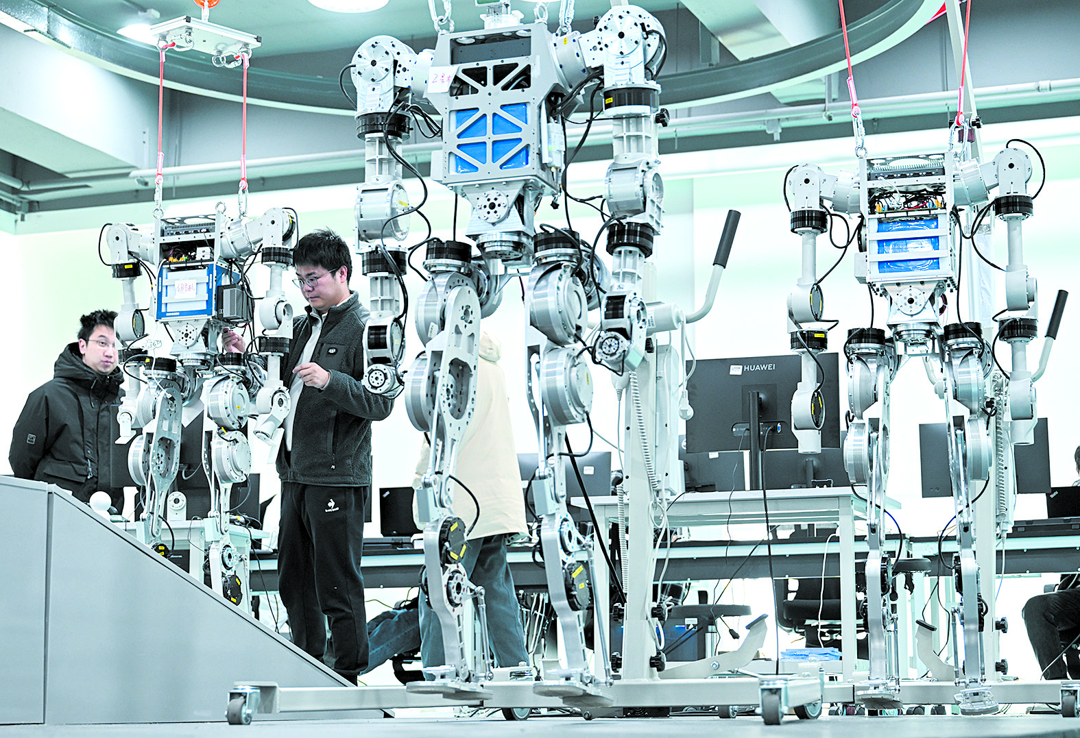 2月24日,在武汉格蓝若智能技术股份有限公司,研发团队成员在调试人形机器人。
